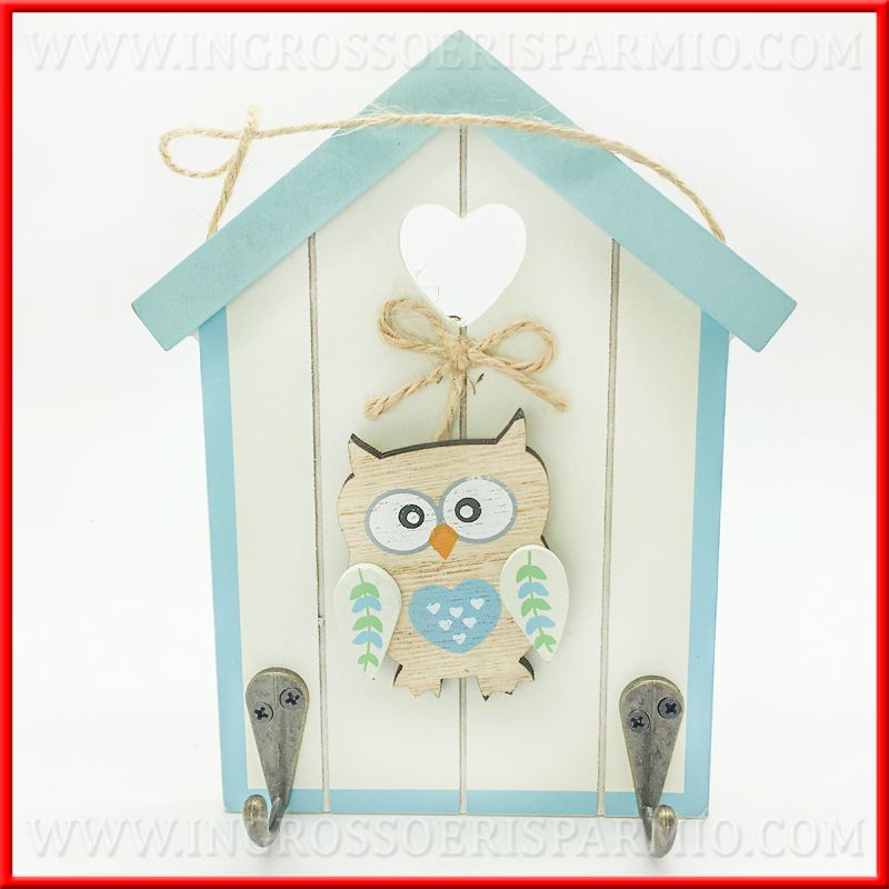 Appendini per cameretta realizzati in legno, a forma di casetta, color crema con bordi e tetto celeste. Al centro è applicato un ciondolo in legno a forma di gufo, decorato con particolari azzurri ed un cuoricino; in basso sono presenti due ganci in metallo. Sul lato superiore è presente uno spago per applicare l'appendino a muro. Utilizza queste bomboniere particolari come appendiabiti piccoli o come portachiavi da parete: in ogni caso questi appendini saranno considerati come bomboniere utili da chi li riceverà!