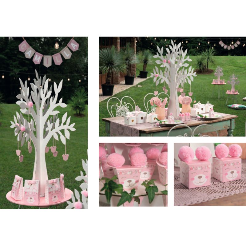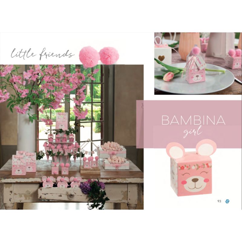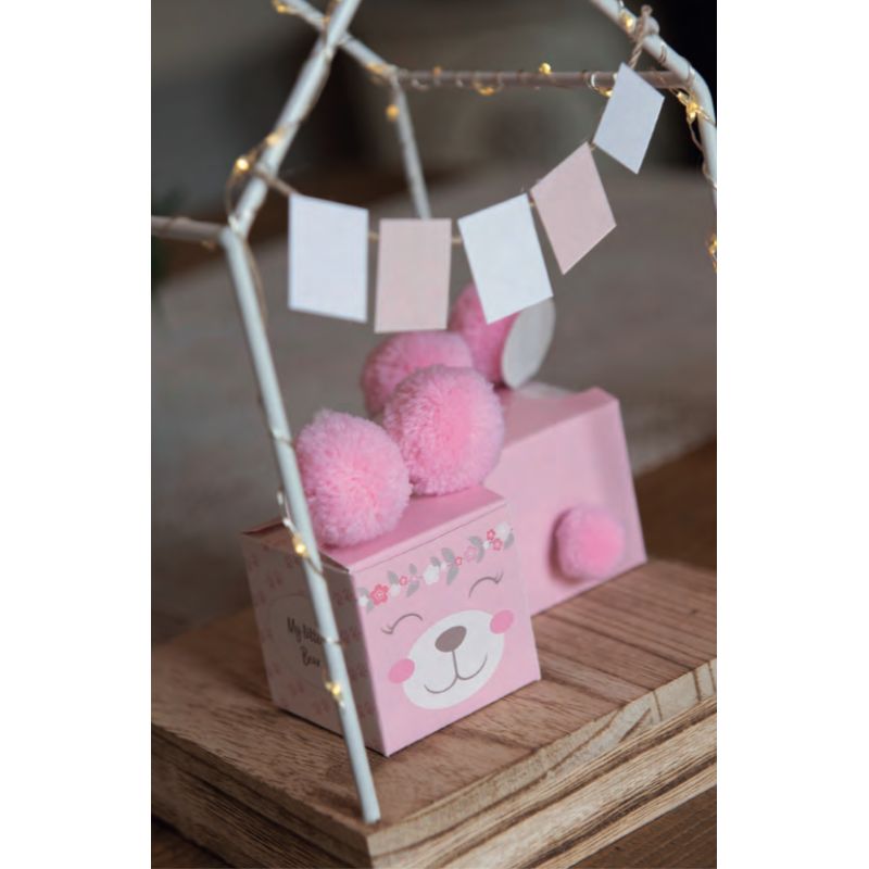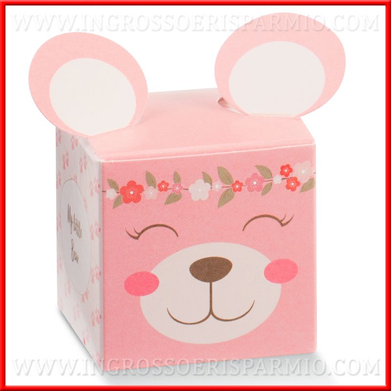 Stock scatole bomboniere porta confetti in cartoncino rosa, di forma cubica quadrata, con sagoma orecchie sporgenti sulla parte superiore. Sul fronte è rappresentato il viso di un tenero orsacchiotto sorridente, mentre i laterali sono decorati da piccole impronte e la scritta "My little bear".