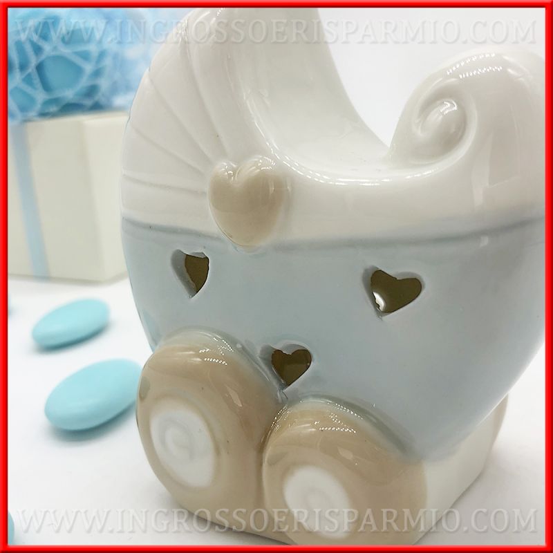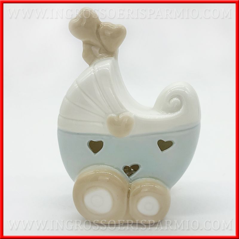 Bomboniere battesimo bambino a forma di carrozzina realizzate in fine ceramica dipinta con colori tenui, bianco, azzurro, avorio. L'elegante culla è decorata da palloncini a forma di cuore. Il passeggino bomboniera ha dei fori attraverso i quali passa la luce generata dal led presente all'interno, che si accende tramite un tasto presente al di sotto.