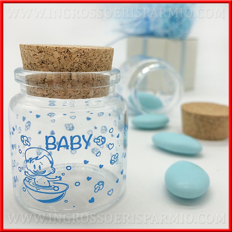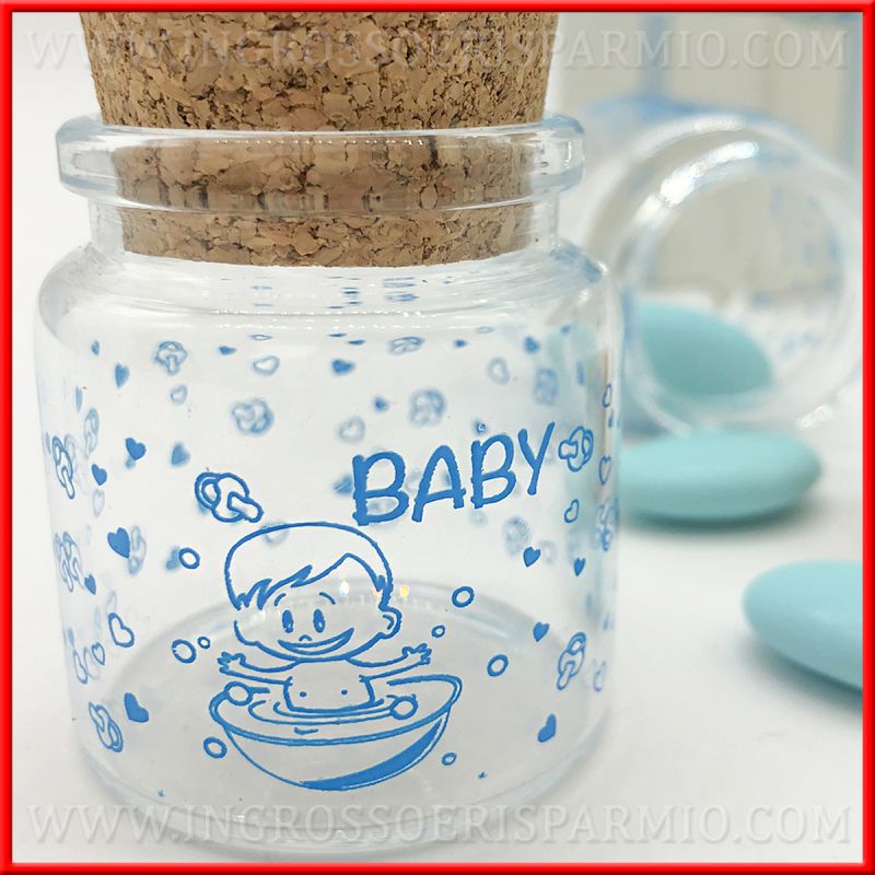 Mini barattoli portaconfetti in vetro trasparente decorati da piccoli disegni a forma di cuore e ciuccio realizzati in azzurro. Al centro è raffigurato un bimbo neonato in una vaschetta per il bagnetto con scritta "Baby", chiusa barattolo con tappo in sughero. Specifici per bomboniere nascita bimbo, maschietto!