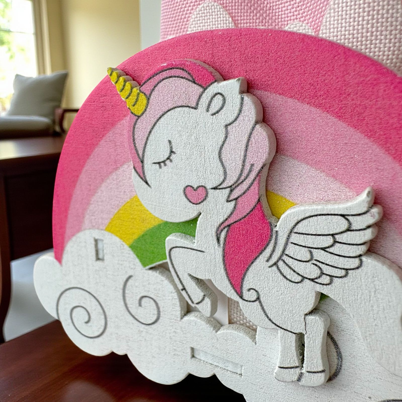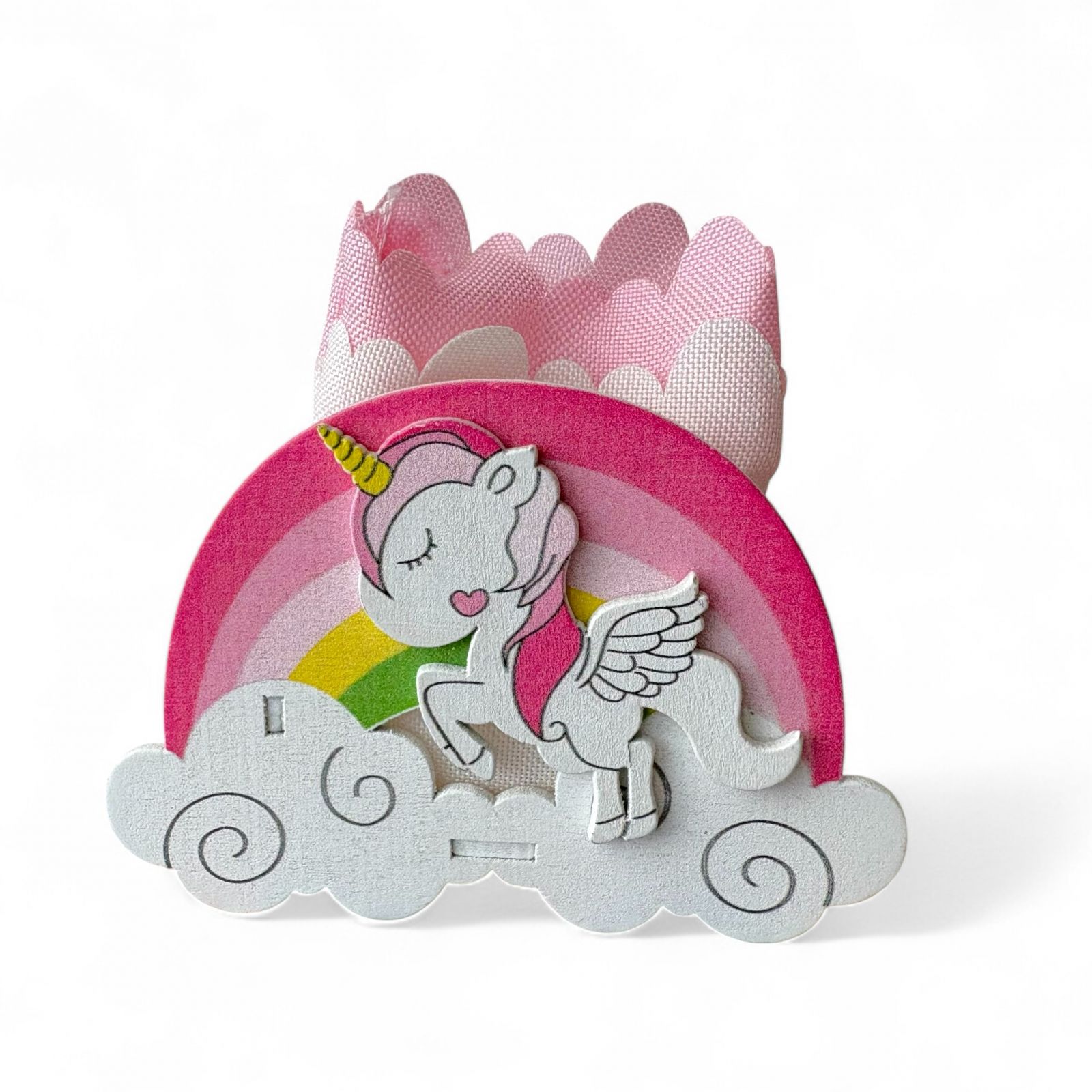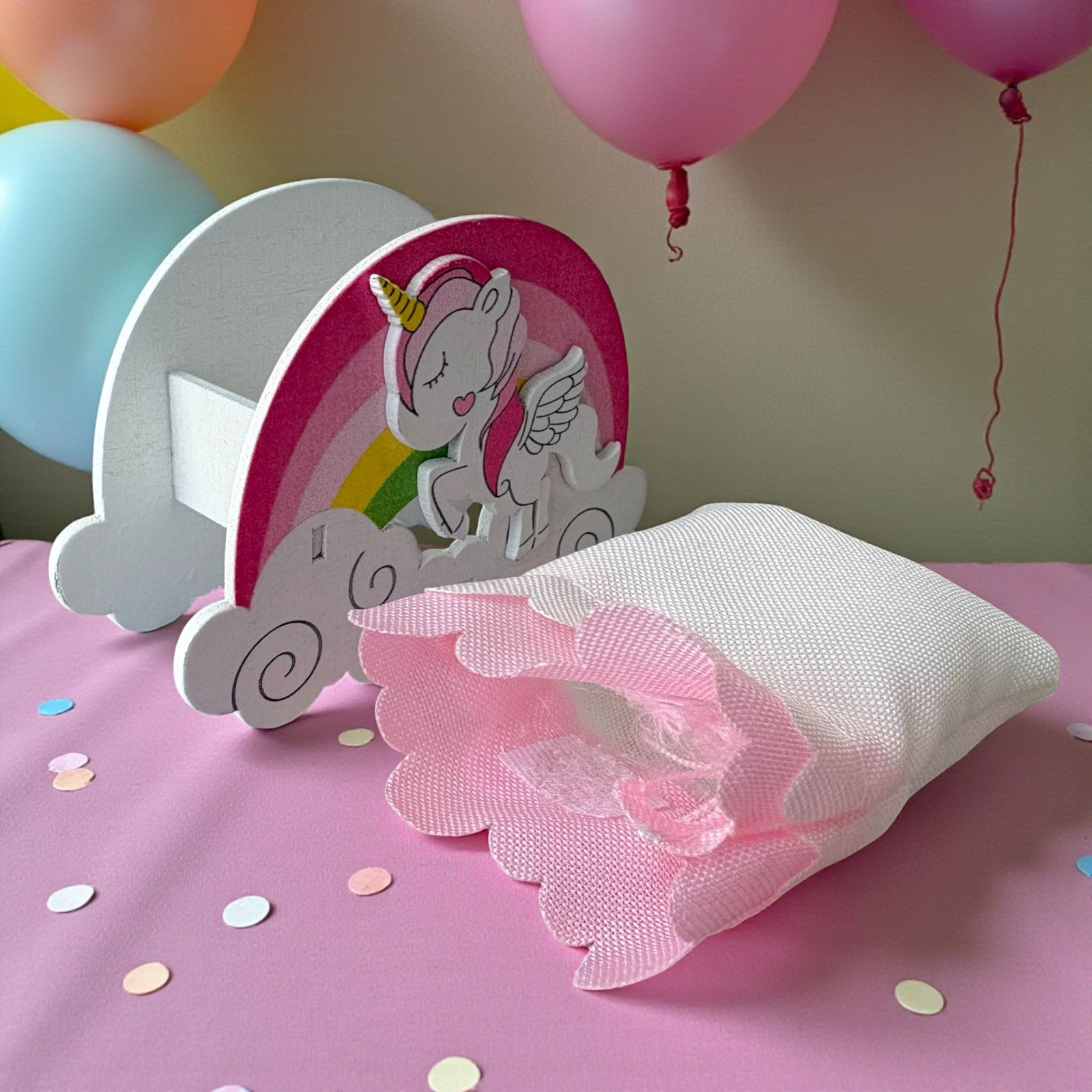 Bomboniere unicorno economiche con funzione di portaconfetti: porta confetti realizzato con la fusone tra una scatoletta ed un sacchetto! Scatole per confetti realizzate in legno a forma di arcobaleno colorato sui toni del rosa, nuvole banche e unicorno bianco con criniera rosa. All'interno di questa speciale struttura in legno è inserito un sacchetto in cotone bianco con bordo superiore rosa, per inserire i confetti nascita.