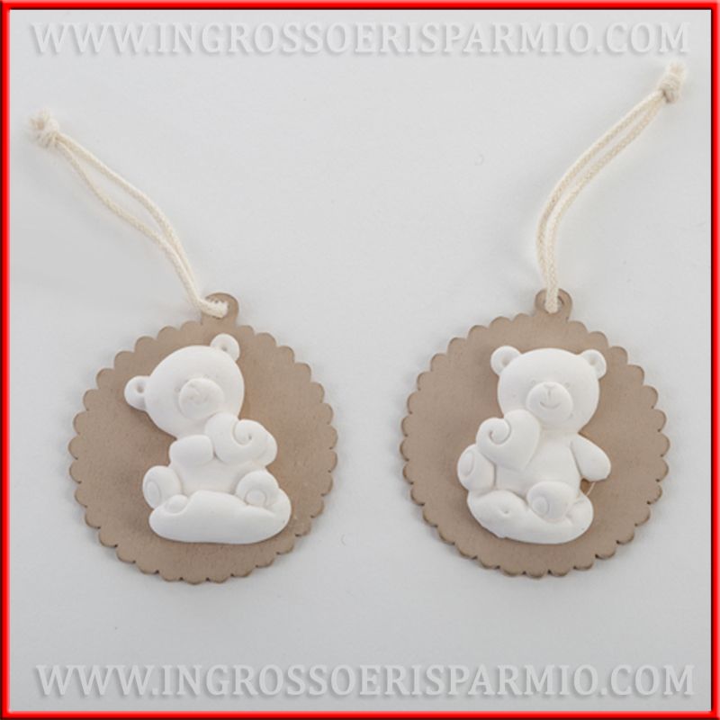 Medaglioni in legno avana / beige con applicazione gessetti bianchi a forma di orsetto, assortiti in due varianti, come in foto. Ideali per arricchire sacchettini nascite e confettate battesimo o per creare vere e proprie bomboniere economiche con orsetti.
