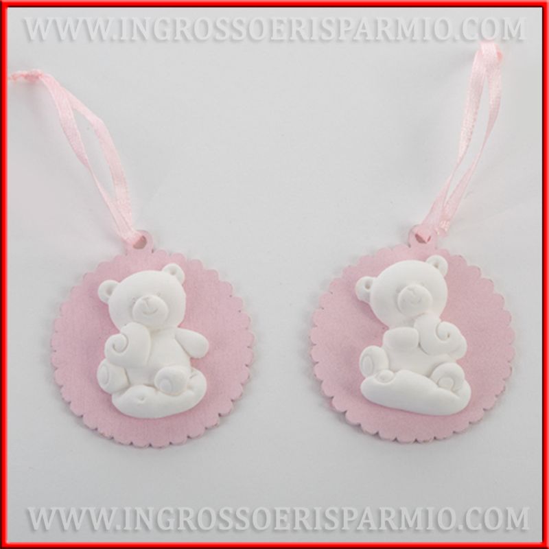 Medaglione in legno di forma rotonda con bordo ondulato e applicazione centrale di un orsacchiotto in gesso bianco, raffigurato con un cuore, posto a destra o sinistra, assortito in due modelli. Bomboniere nascita bimba fornite di nastrino in raso, appendino.