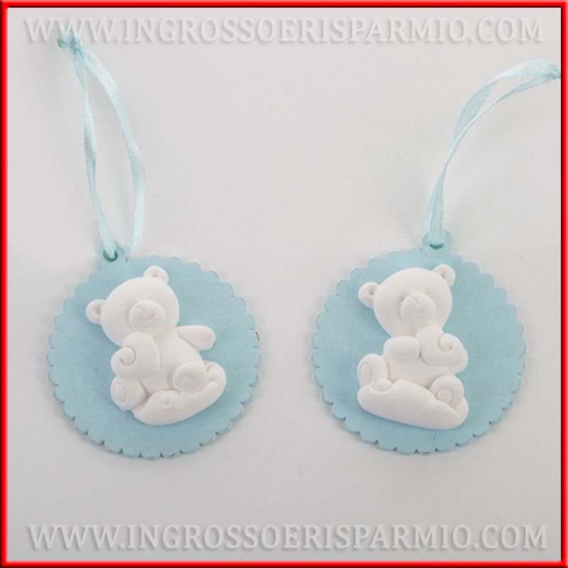 Appendini in legno di forma rotonda di colore celeste con applicazione di gessi bomboniere orsetti, raffigurati con un cuore, posto a destra o a sinistra (modelli assortiti). Nastrino in raso azzurro incluso, per poter utilizzare queste bomboniere nascita bimbo come appendini.