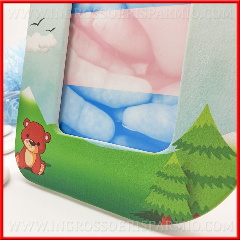 Cornici per foto in ecopelle, con stampa dai colori nitidi e vivaci, raffigurante un bosco, con prato, alberi e cielo azzurro ed un tenero orsacchiotto, posto nell'angolo in basso a sinistra. Perfette per incorniciare le foto dei bambini.