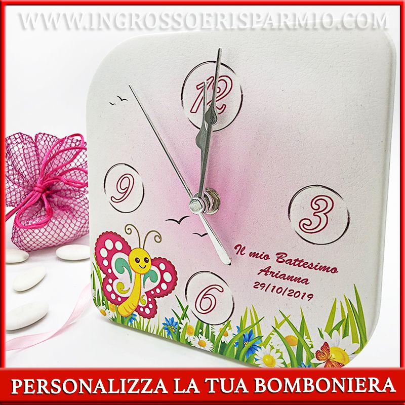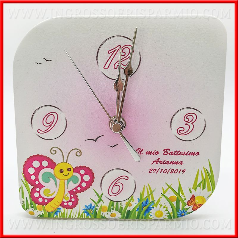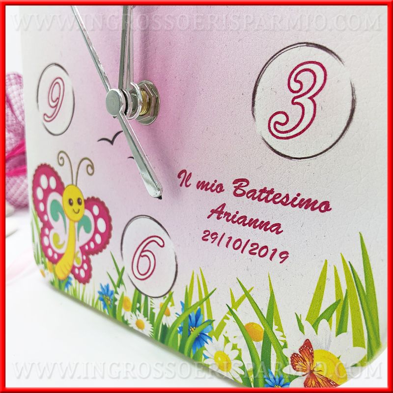 Simpatico orologio battesimo, creazione artigianale, realizzato con supporto in legno rivestito in ecopelle con stampa colorata di un prato fiorito con una farfalla e sfondo rosa, ideale per l'evento di una femminuccia. Gli orologi bomboniera possono essere utilizzati sia in appoggio che al muro, in quanto dotati sia di gancio che di piede d'appoggio.