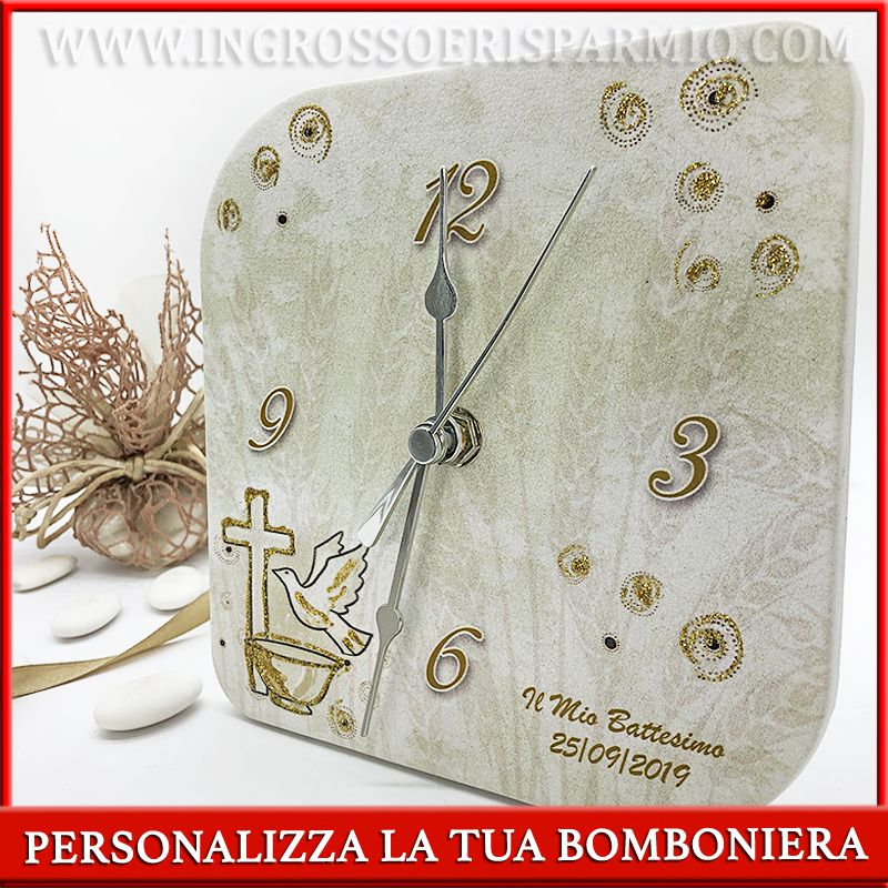 A rendere speciali queste bomboniere orologio è la possibilità di richiedere la PERSONALIZZAZIONE CON NOME E DATA, rendendo uniche le tue bomboniere per battesimo.