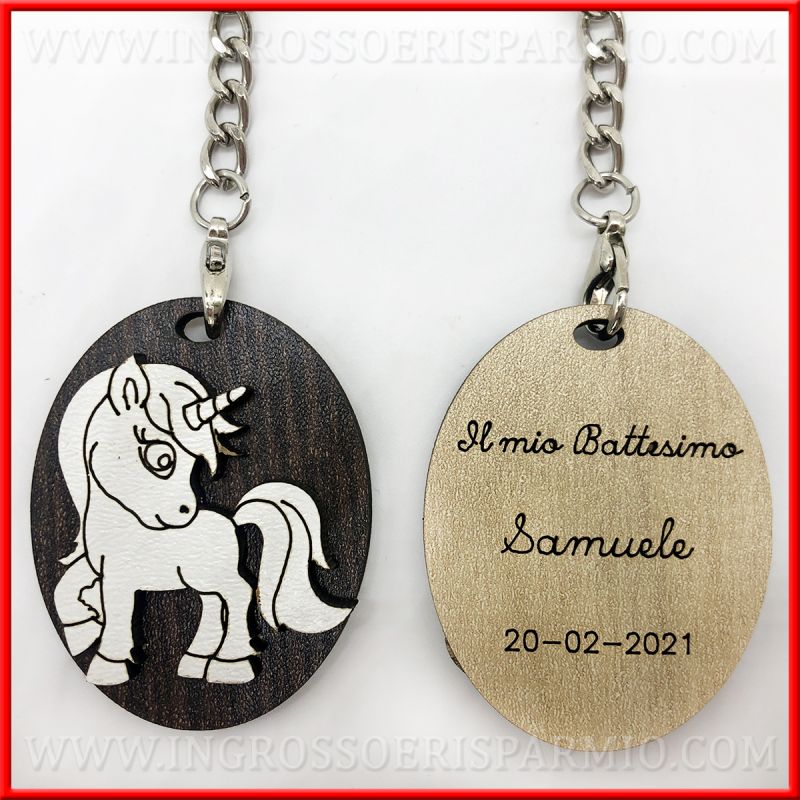Portachiavi legno con ciondolo unicorno: la sagoma del cavallo alato è posta su una base di forma ovale, con tonalità di legno contrastanti tra loro.