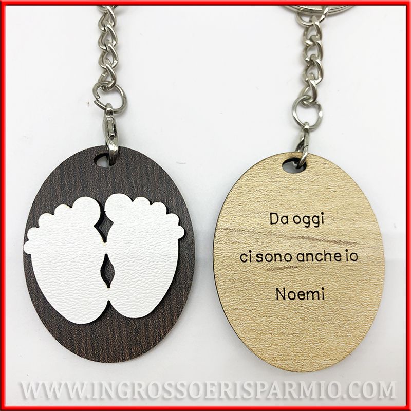 Ti presentiamo i nostri portachiavi impronte personalizzati: realizzati artigianalmente in legno su una base ovale di colore scuro, riportano un applicazione a forma di impronte su un lato, selezionabile nei colori bianco, rosa e azzurro. Sulla parte superiore è presente il gancetto con catenina e anello in acciaio da attaccare alle chiavi.