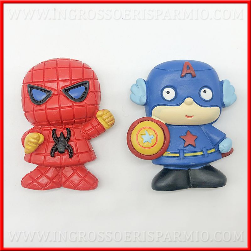 Bomboniere calamite compleanno tema supereroi: calamite originali raffiguranti i personaggi Marvel Capitan America e Spider man (Uomo Ragno), da utilizzare come magneti compleanno, calamite nascita e battesimo bambino.