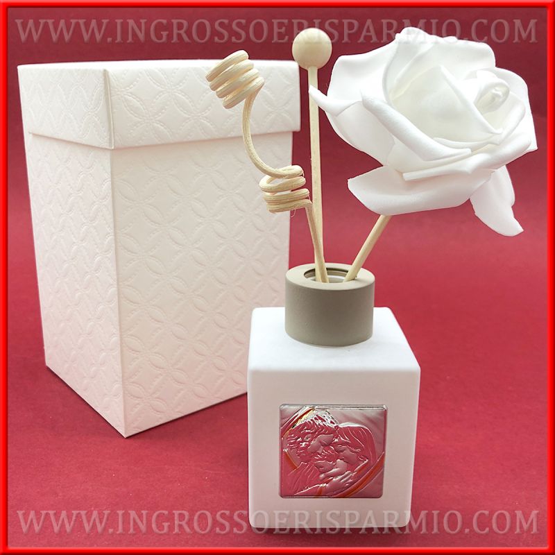 Bomboniere battesimo eleganti, con diffusore per essenze moderno, realizzato con porta profumo in vetro satinato bianco, di forma quadrata, tappo a vite in legno tortora e piastrina argentata raffigurante l'immagine sacra famiglia, con dettagli dorati.