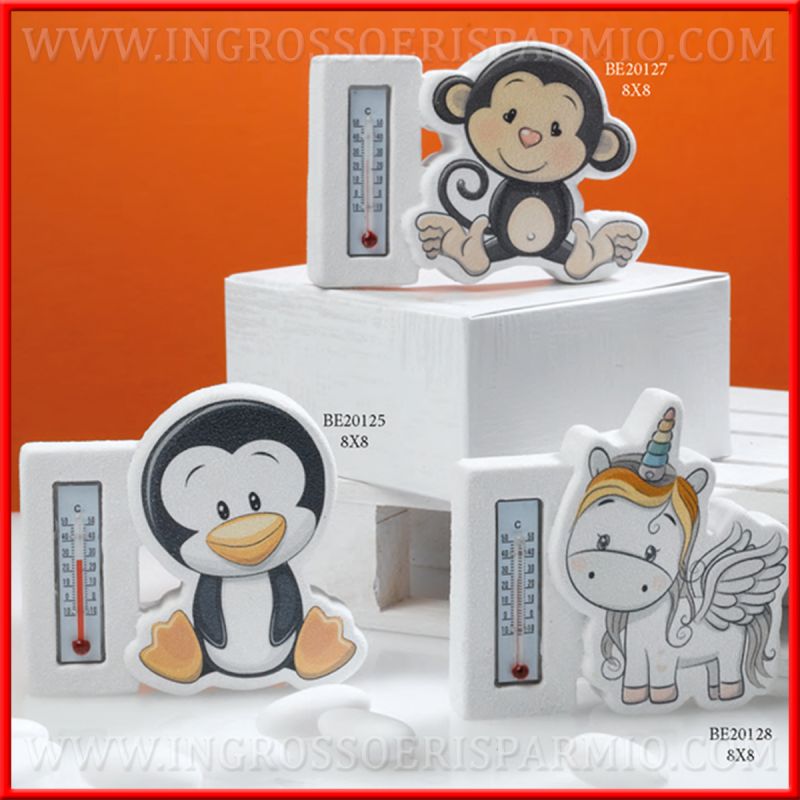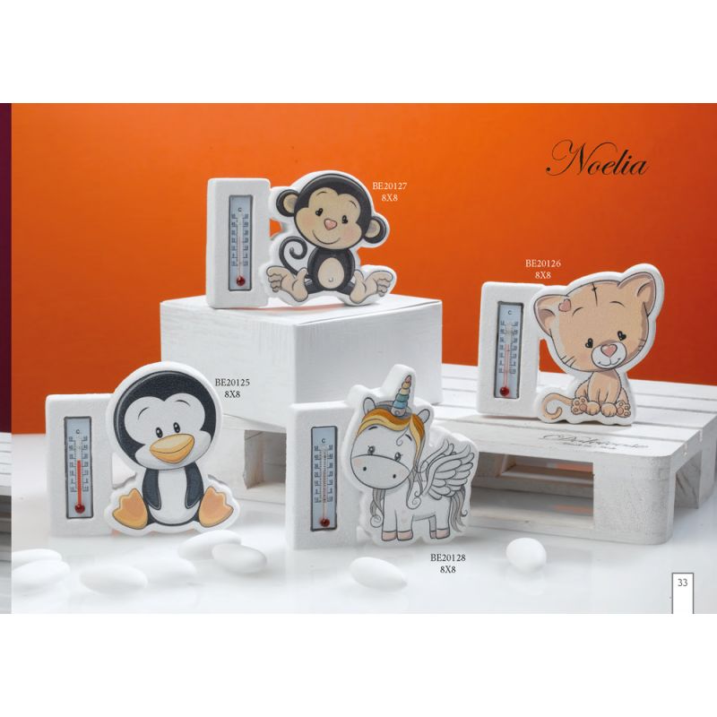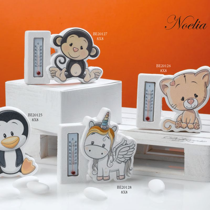 Termometro ambiente trasformato in bellissime bomboniere per battesimo, arricchito da soggetti animaletti colorati.