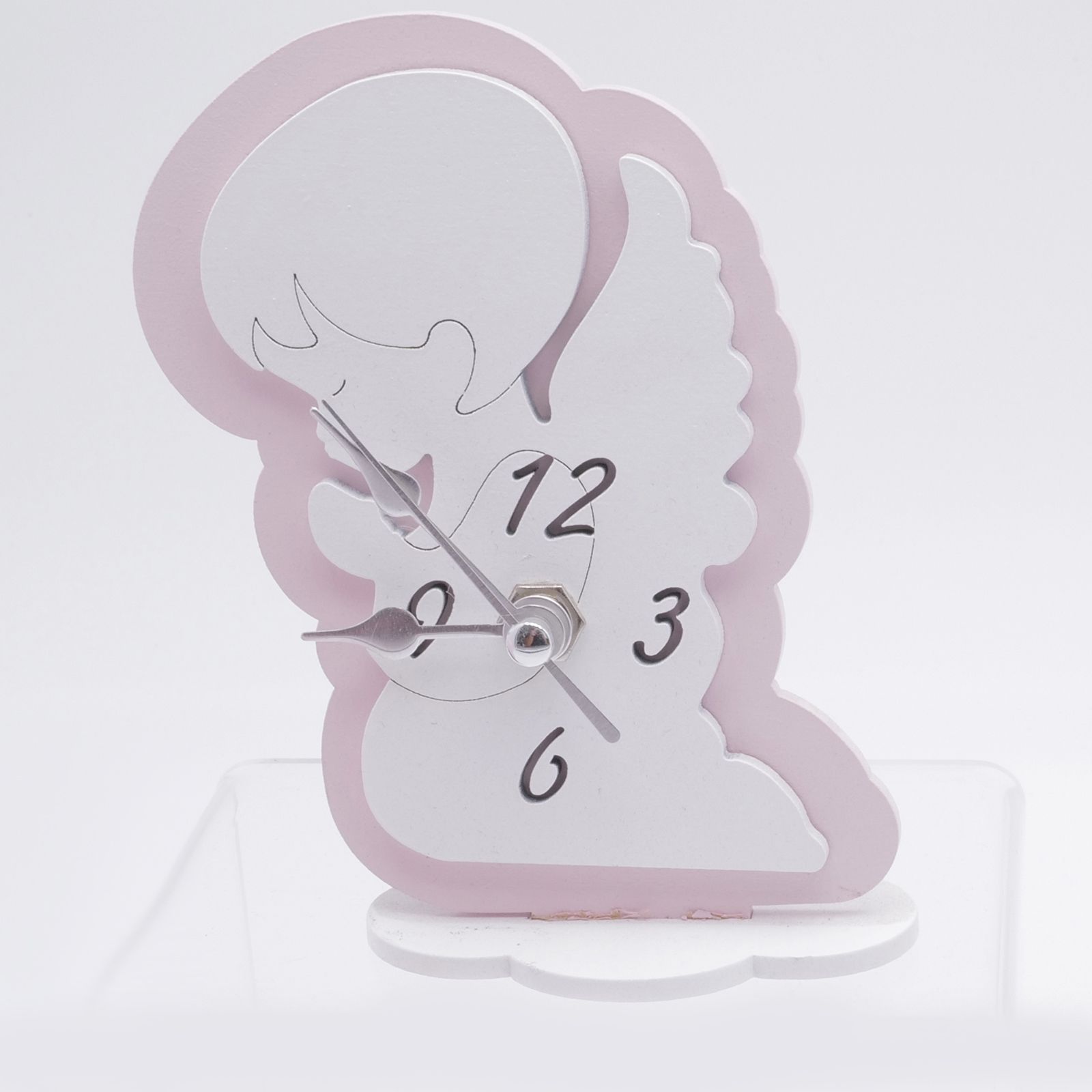 Scegli un orologio in legno come ricordo del battesimo della tua bambina: orologi particolari, personalizzati per femminuccia, in legno rosa e bianco. Orologi da tavolo, con supporto in legno posteriore e lancette silver.
