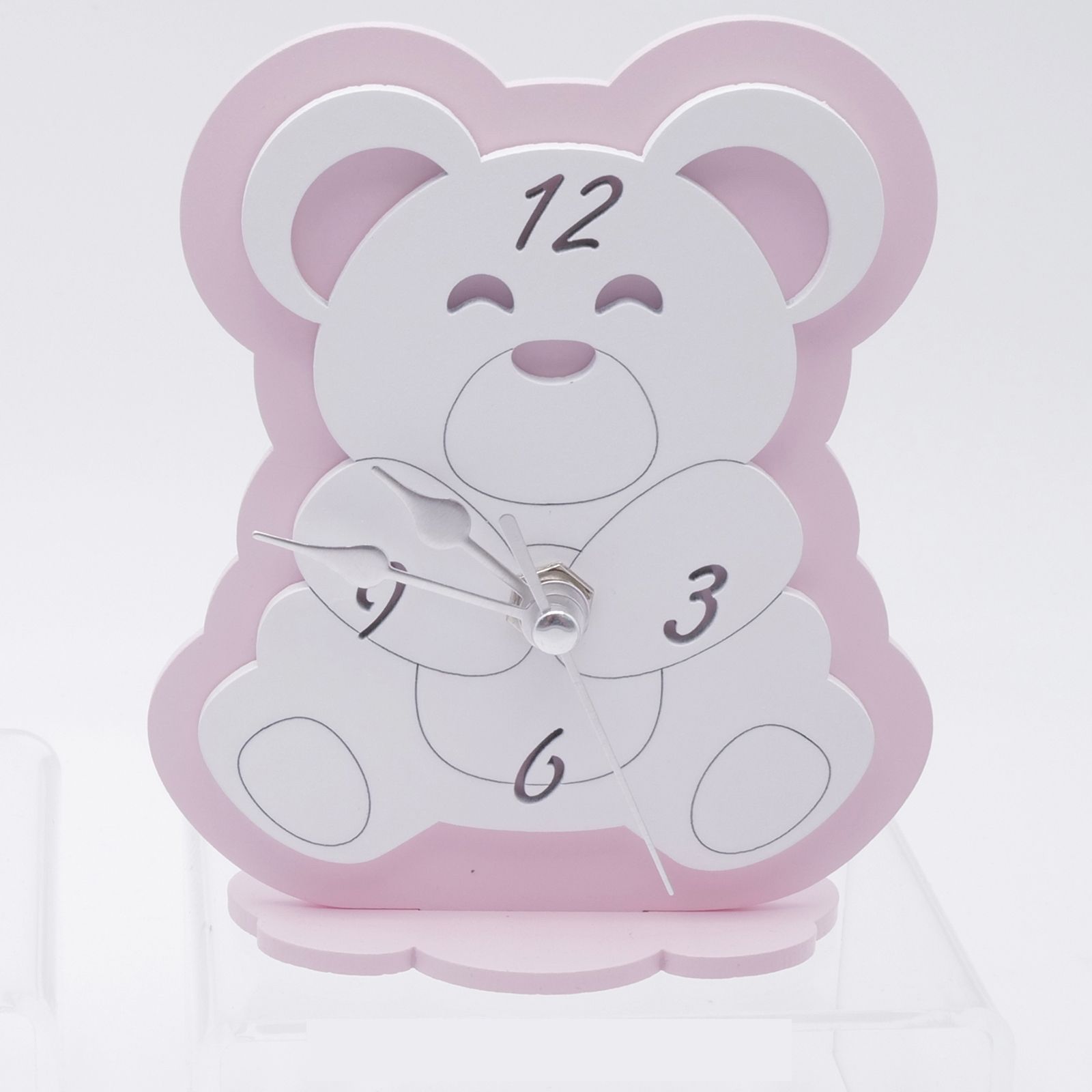 Bomboniere orologio da tavolo, semplici e raffinate, in legno bianco e rosa. Gli orologi battesimo sono composti da una sagoma orsetto in legno rosa e bianco con lancette argentate e numeri intagliati sull'orsetto stesso. Ideali come orologi bambini per camerette, quindi perfetti e desideri realizzare bomboniere battesimo bimba utili, oltre che originali!