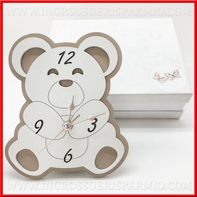 Orologio in legno, con supporto da appoggio, a forma di orsacchiotto, nei colori bianco e tortora, neutri, ideali per battesimo maschietto o femminuccia. Lancette metallizzate e numeri intagliati sulla parte di legno bianco.