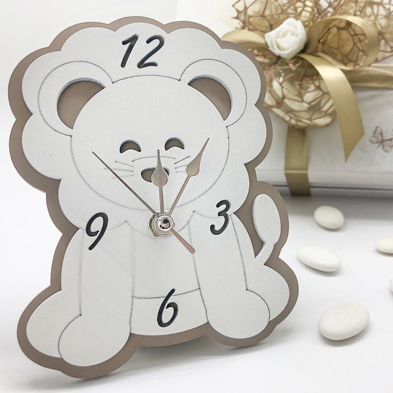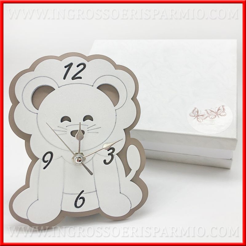 Orologi in legno a forma di leone, simpatico soggetto ideale per l'evento di un maschietto. Composto da una base tortora, il leoncino è raffigurato su legno bianco, con dettagli incisi ed altri intagliati. Lancette in silver e supporto retrostante per l'utilizzo come orologio da appoggio.