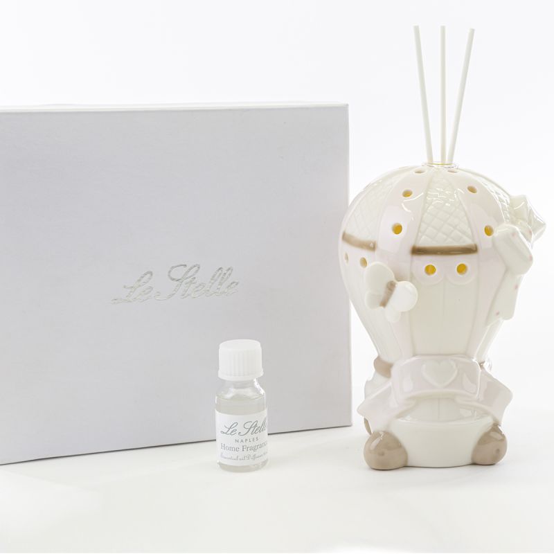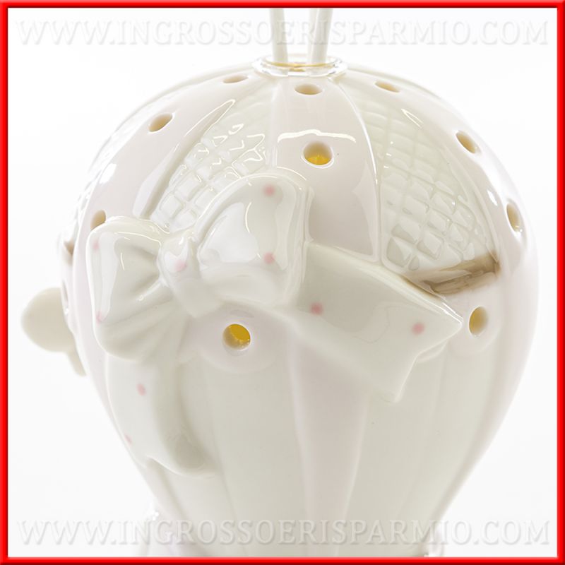 Mongolfiera in ceramica bianca e rosa con fiala in vetro porta profumo ambiente e bastoncini. Eleganti, raffinate, le mongolfiere sono curate in ogni dettaglio e presentano fori nella parte superiore, da cui viene fuori la luce del led, posizionato al suo interno: profumatore e mini lampada, in un unico oggetto.