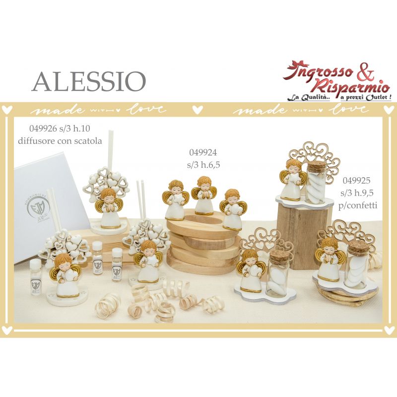 Bomboniera composta da una base in legno con albero della vita su cui sono applicate una statuina in resina a forma di angelo, raffigurato con tunica bianca e ali dorate, in 3 varianti assortite (come in foto), e una fiala in vetro con tappo in sughero.