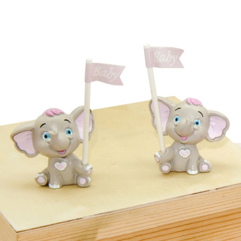 Piccole statuine in resina colorata, tridimensionali, a forma di elefantino in posizione seduta con una bandierina con la scritta "Baby". Ciuffo, orecchie e bandierina in tonalità rosa, così da poter usare queste bomboniere economiche nascita solo per bambina, personalizzate!