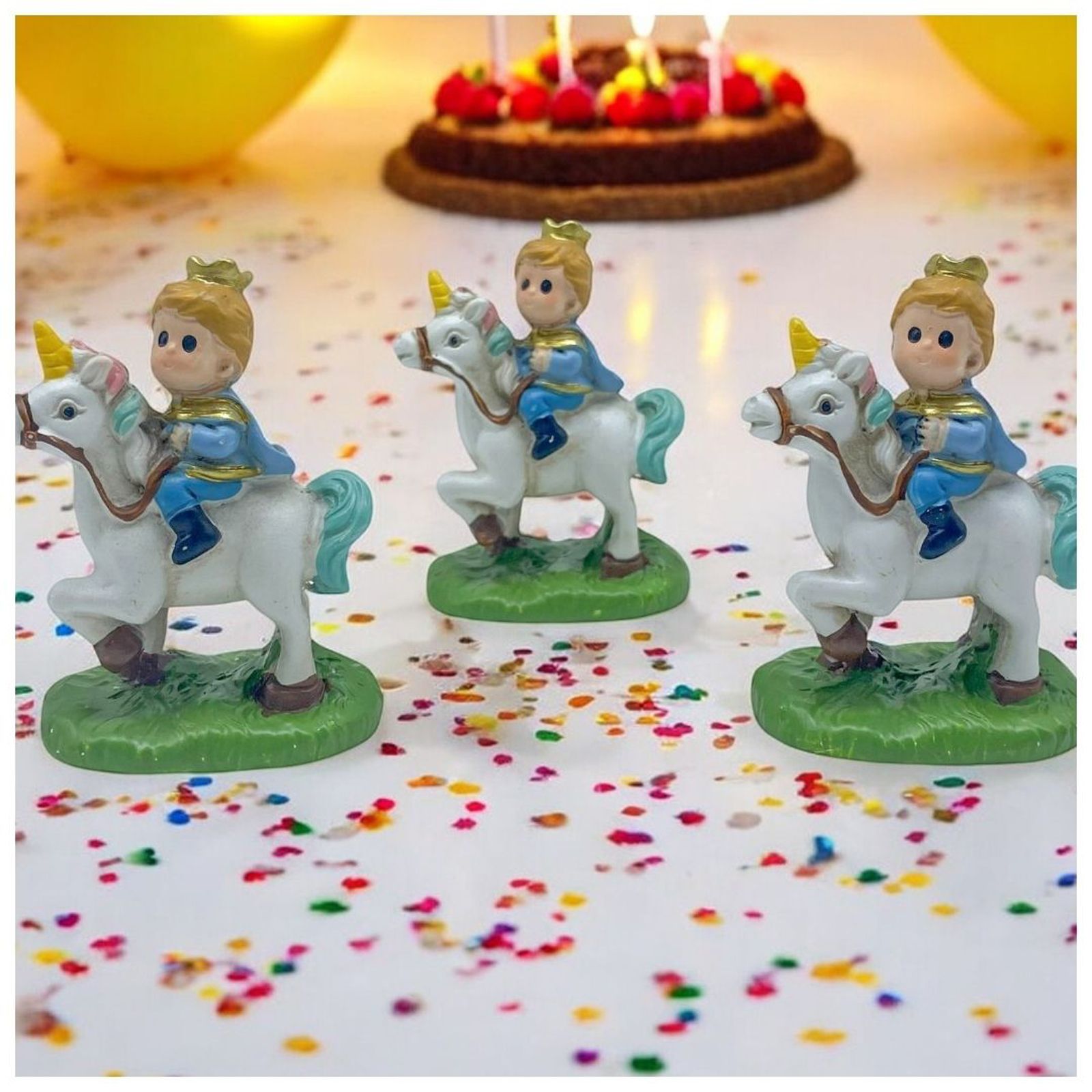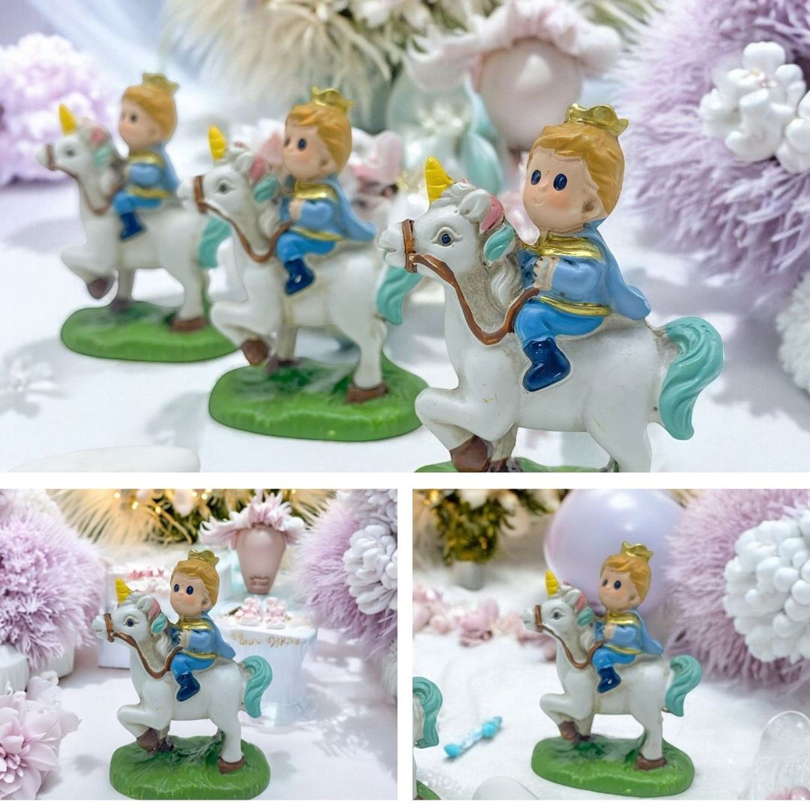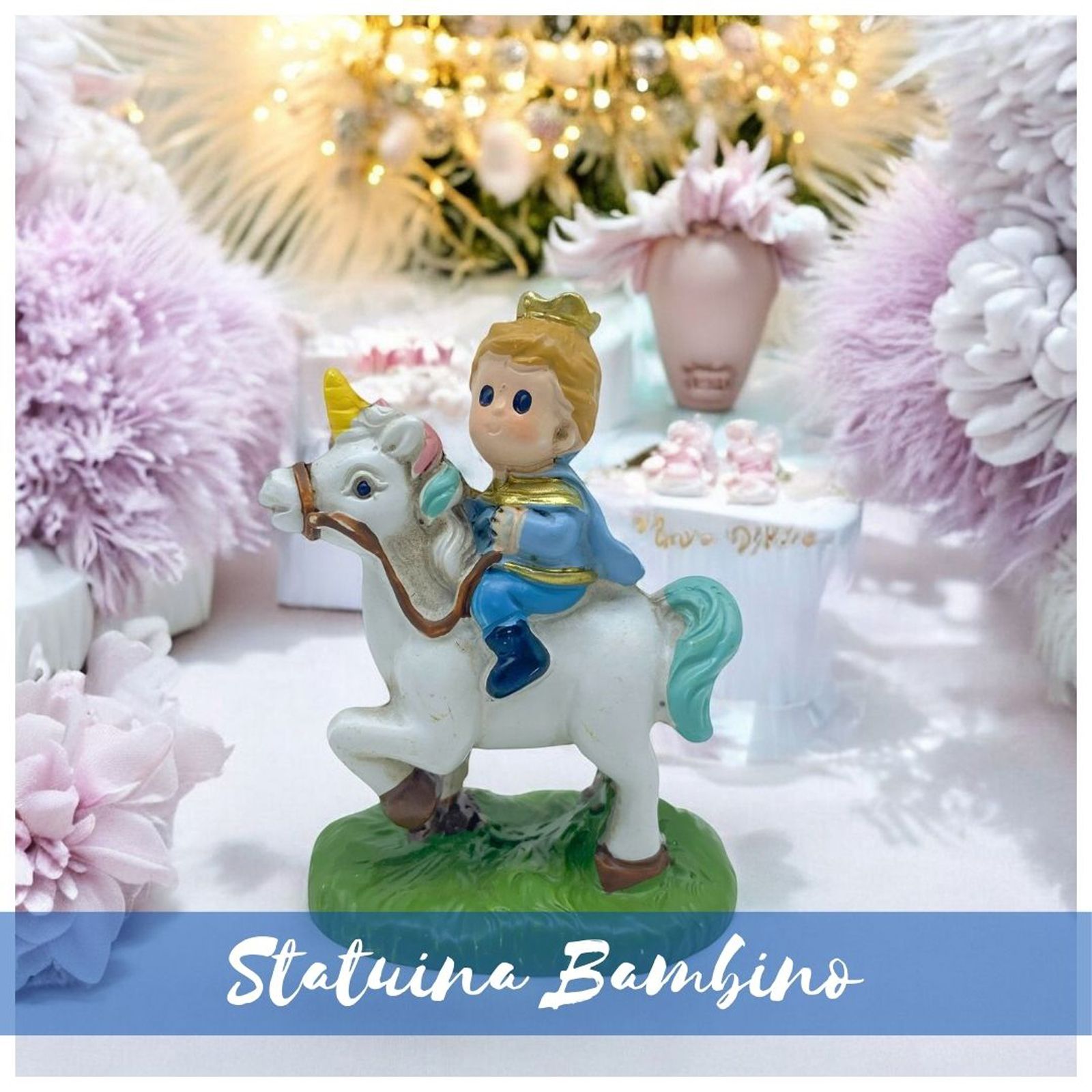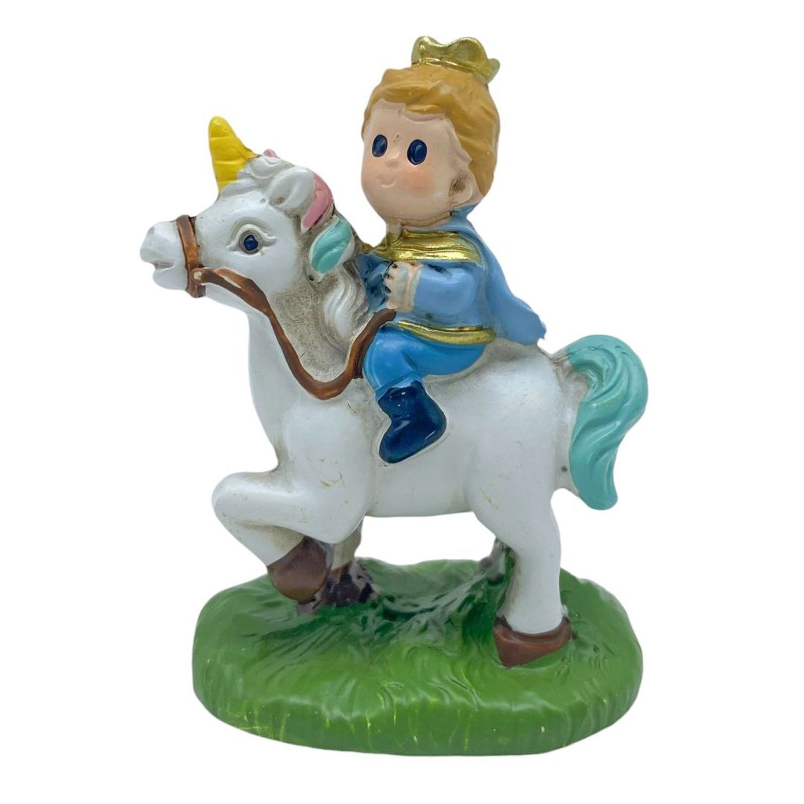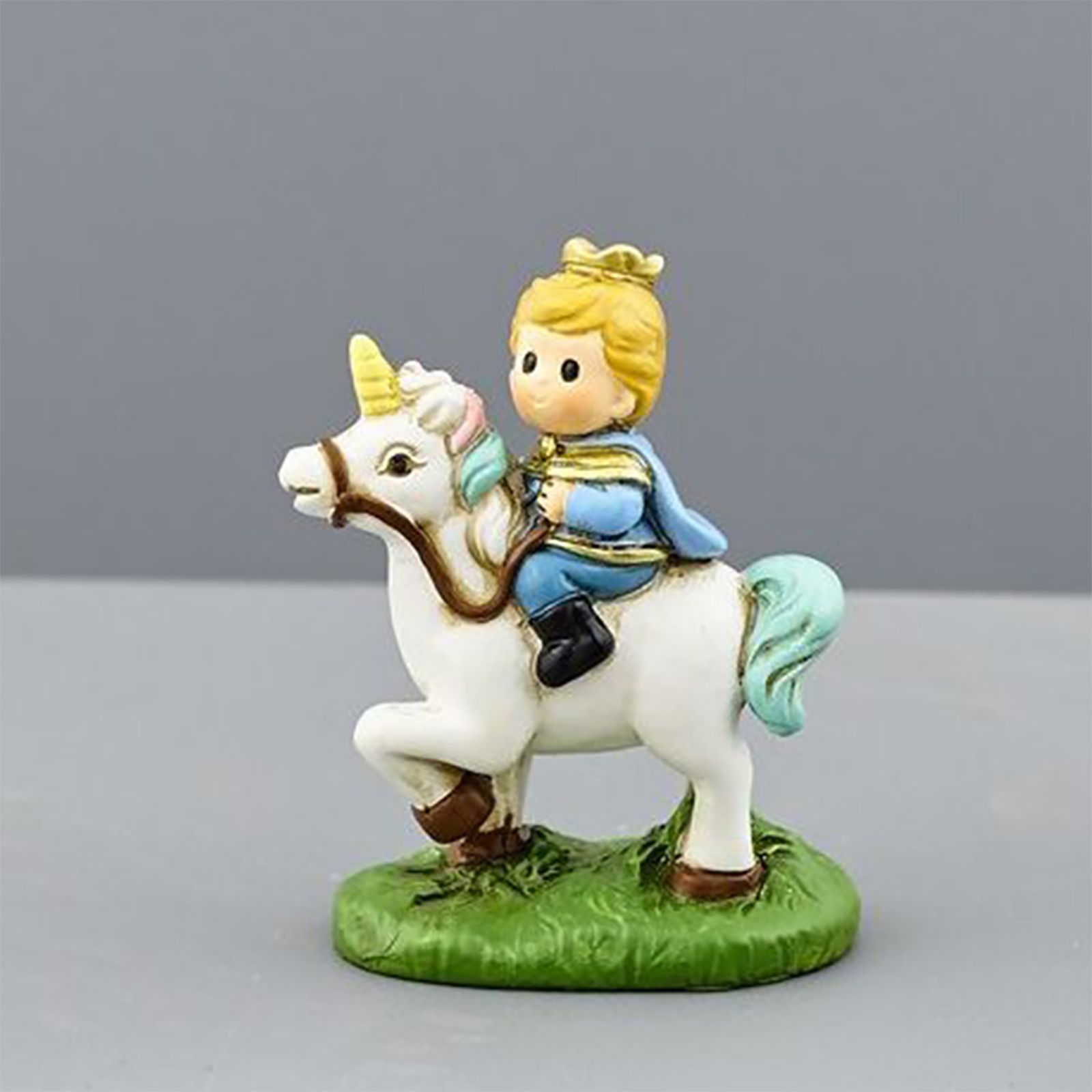 Statuetta in resina con soggetto principino con abito azzurro e corona in sella ad un cavallo bianco.