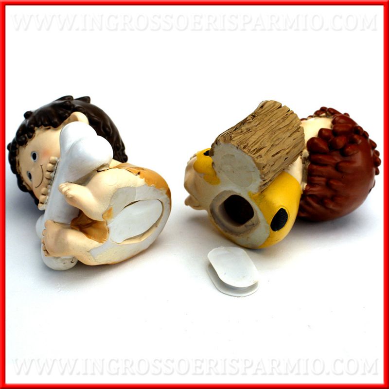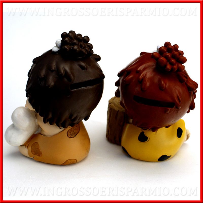 Salvadanaio in resina raffigurante una tenera bambina in abiti della preistoria, simili alla simpatica Ciottolina personaggio del famoso cartone animato The Flintstones. Assortiti in 2 soggetti, con osso e tronco d'albero.