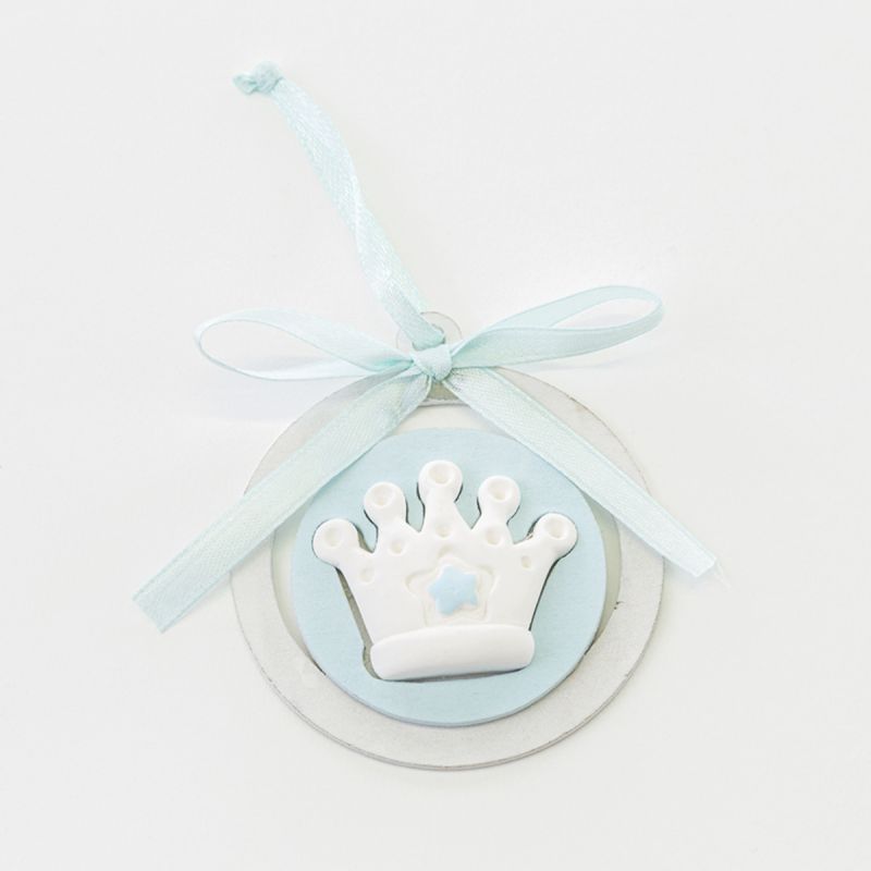 Medaglione in legno bianco e azzurro di forma rotonda con corona in gesso bianco fissata al centro. Bomboniere appendini, complete di fiocco in raso celeste.