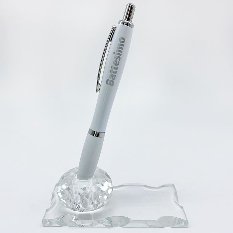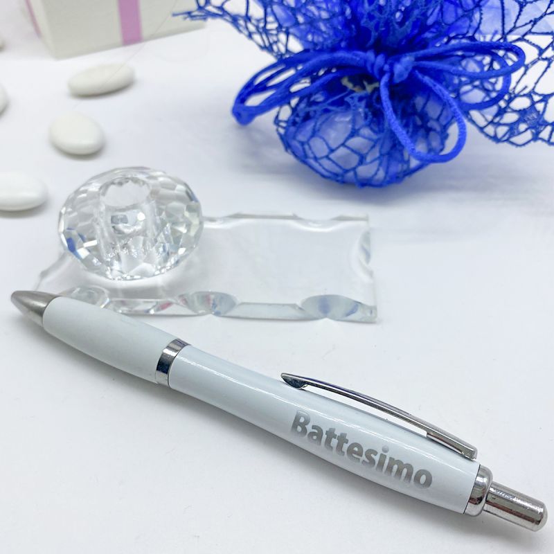 Per te nel nostro store, è disponibile questo elegante set adatto per idee bomboniere utili battesimo, composto da base portapenne in vetro con lavorazione cristallo, di forma rettangolare con una raffinata impugnatura con foro in cui poggiare la penna a sfera in tonalità bianca con dettagli cromati e apertura a click. In corrispondenza del ferretto fermacarte, è presente la stampa in un delicato colore argento della scritta "Battesimo". L'inchiostro è di colore nero.
