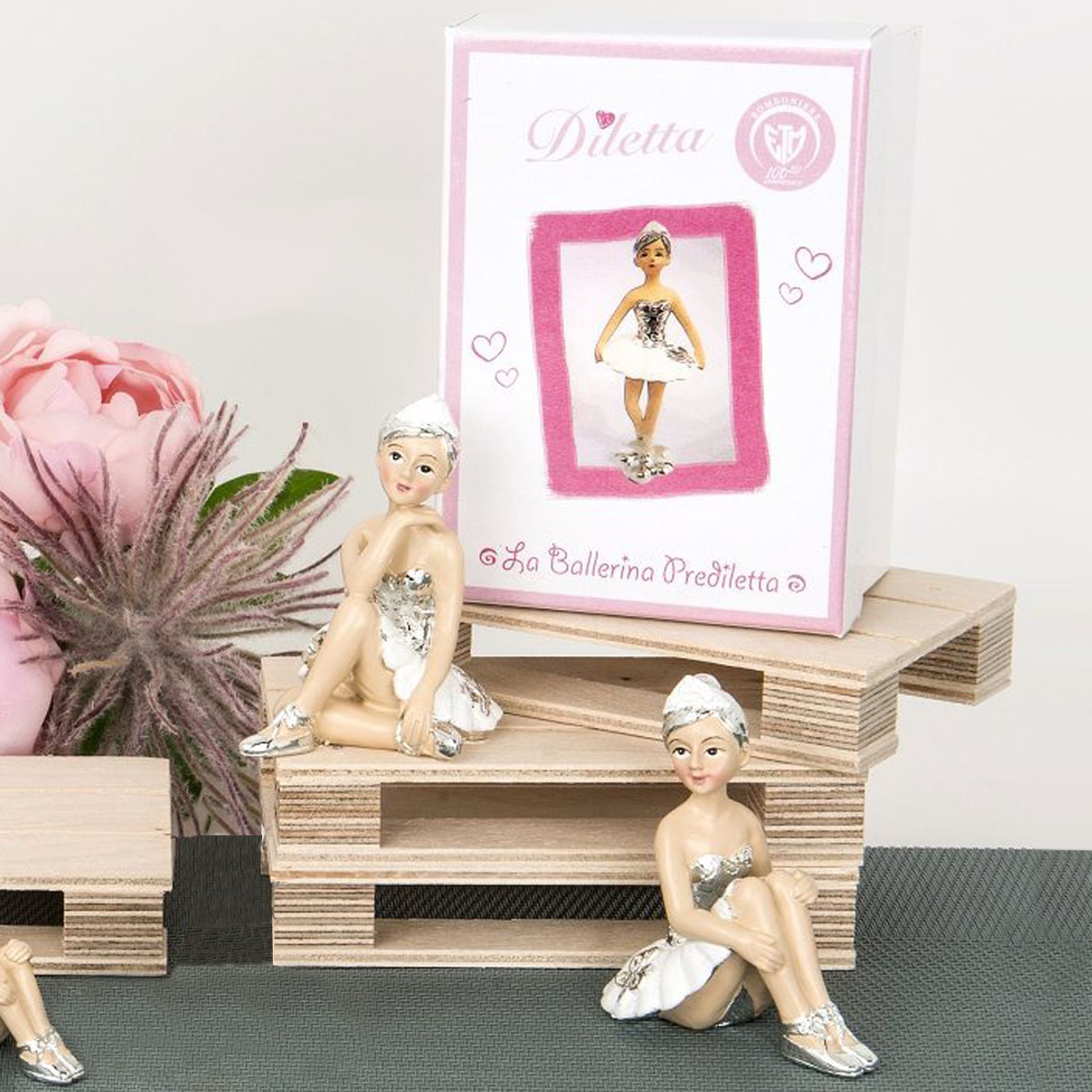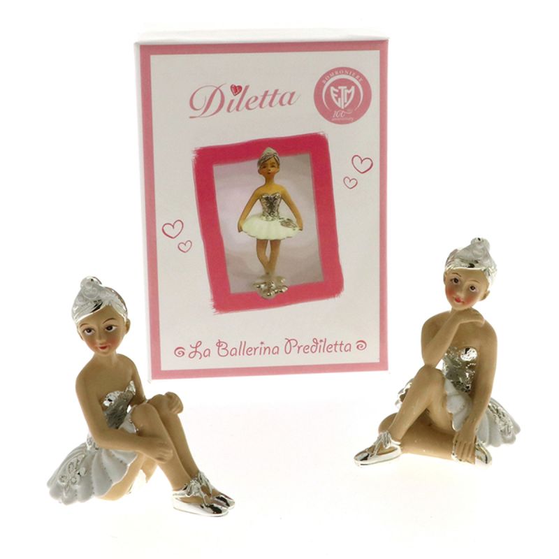 Ti presentiamo Diletta, una graziosa ballerina seduta (disponibile in due pose assortite senza possibilità di selezione in caso di acquisti multipli) con dettagli in resina argentata che arriverà a casa tua con una scatola di cartoncino con rappresentata l'immagine della ballerina con il testo: "Diletta la ballerina prediletta".