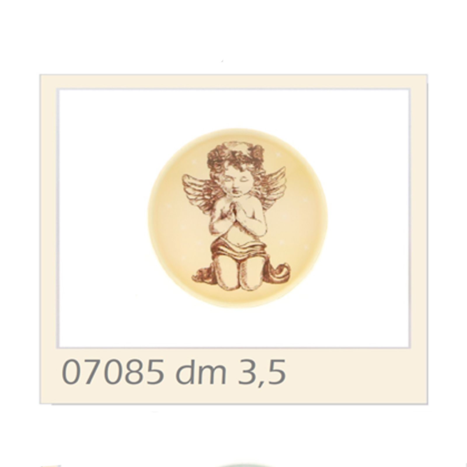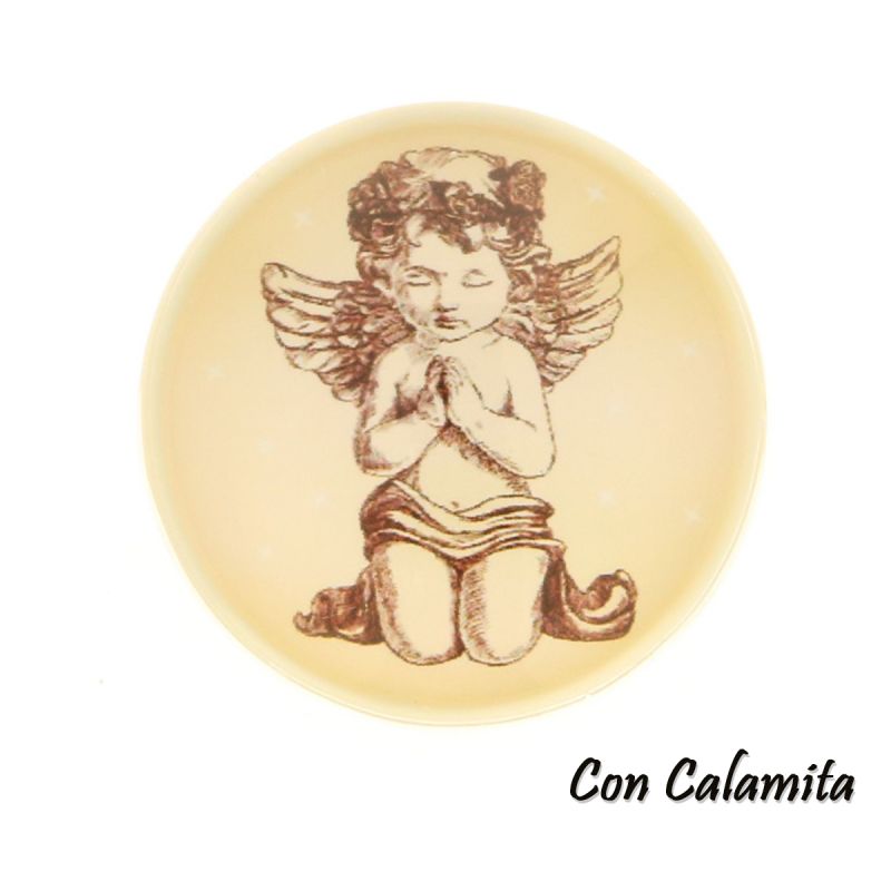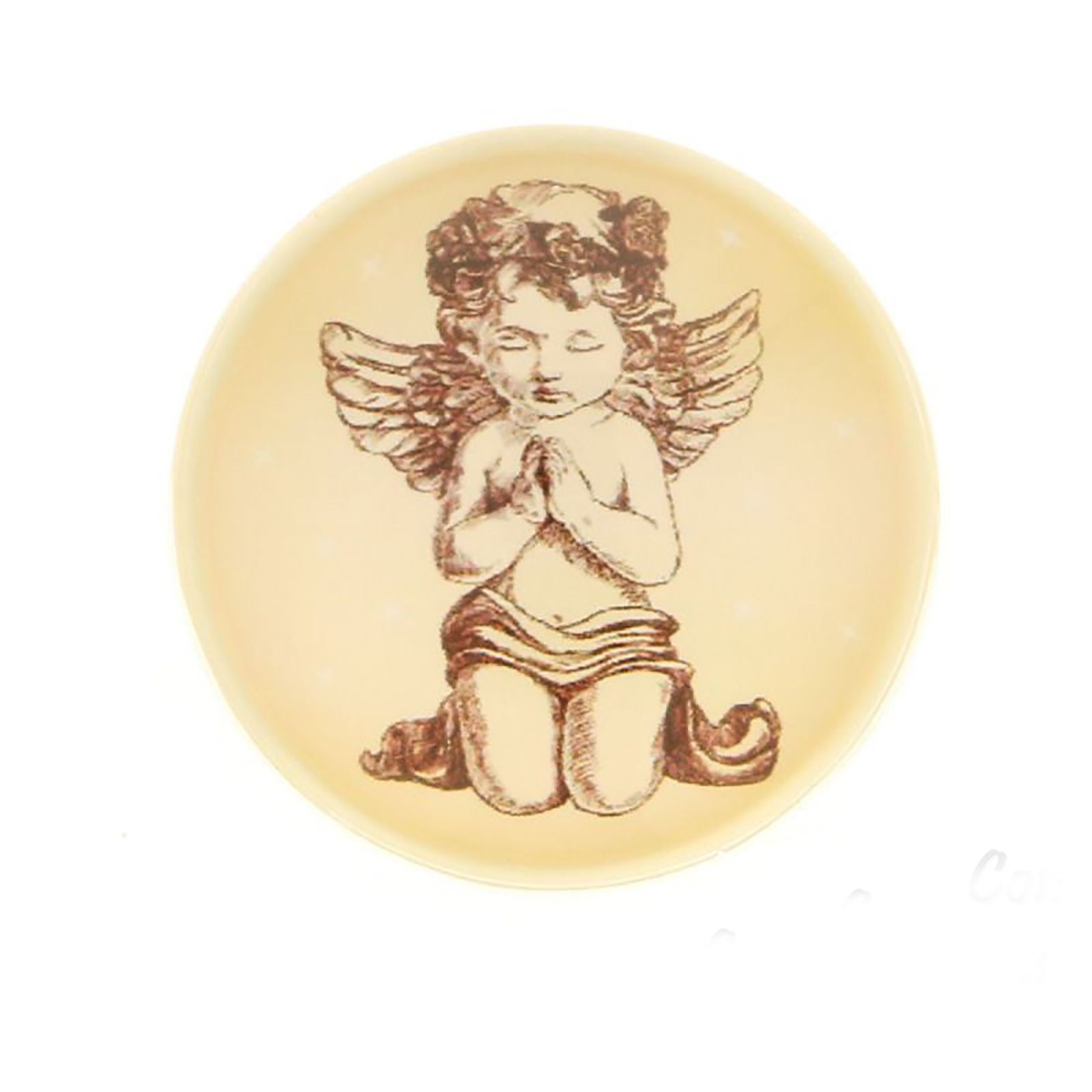 Magnete angelo, realizzato in vetro, di forma rotonda, con raffigurazione angioletto in ginocchio a mani giunte realizzata con toni neutri , (avorio e marrone), utilizzabile sia come calamite battesimo bimba, che bimbo.