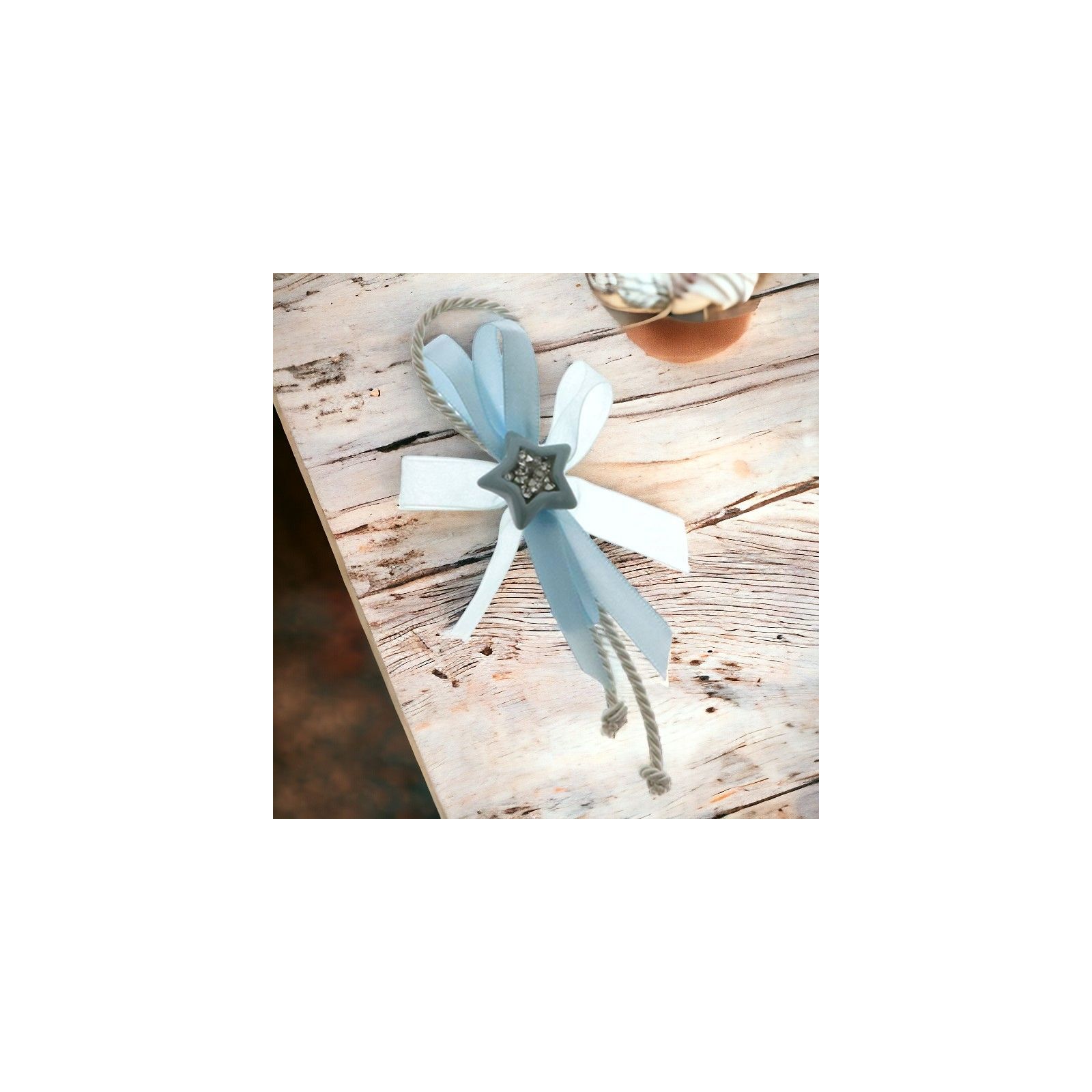 Ti presentiamo quest'articolo realizzato in stoffa e resina con applicazione di corde e nastri e al centro una delicata stellina azzurra con l'interno brillante.