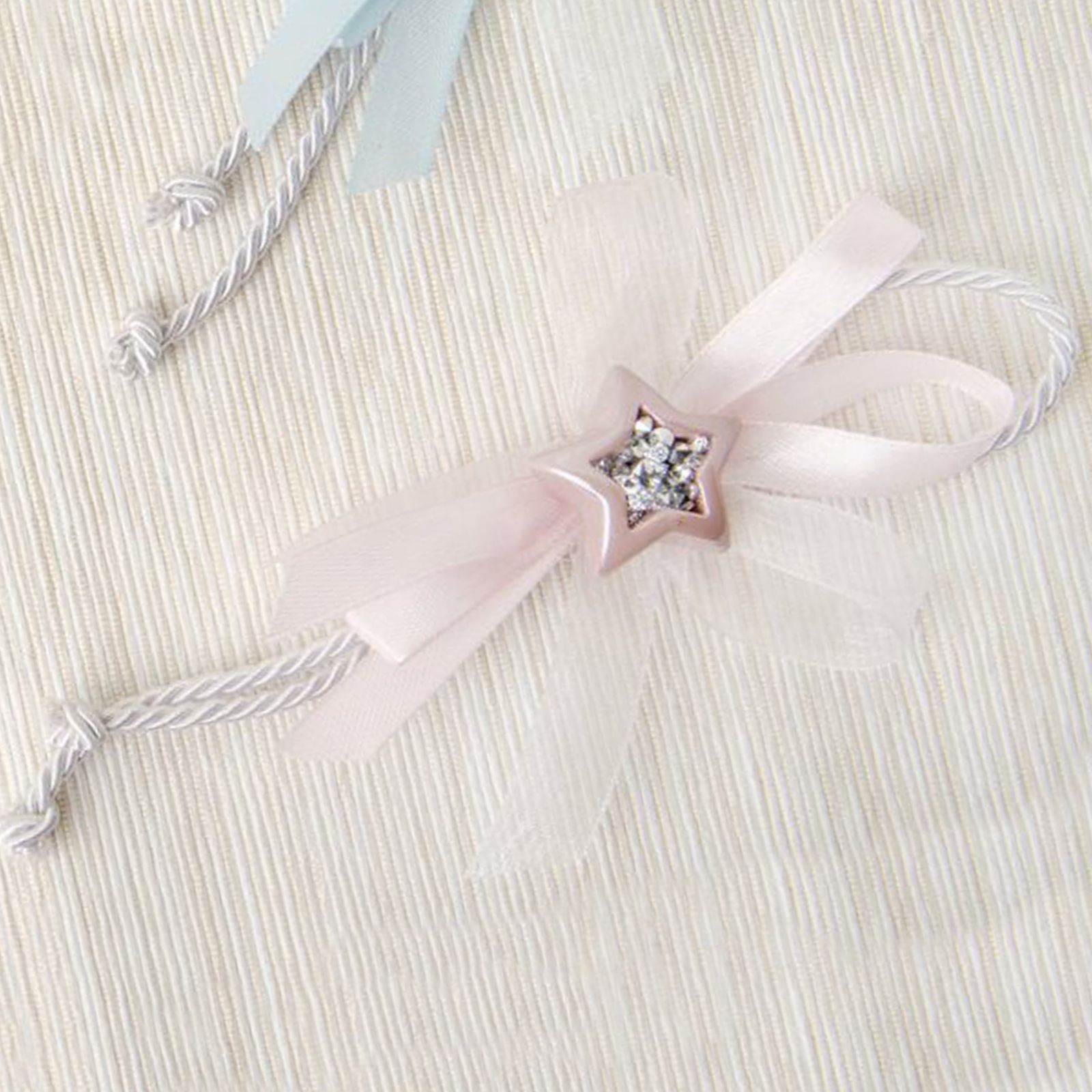 Abbiamo selezionato per te questi graziosi segnaposti battesimo bambina in resina e stoffa, con diverse applicazioni di corde e nastri e una piccola stella centrale in tinta con l'interno effetto glitter.