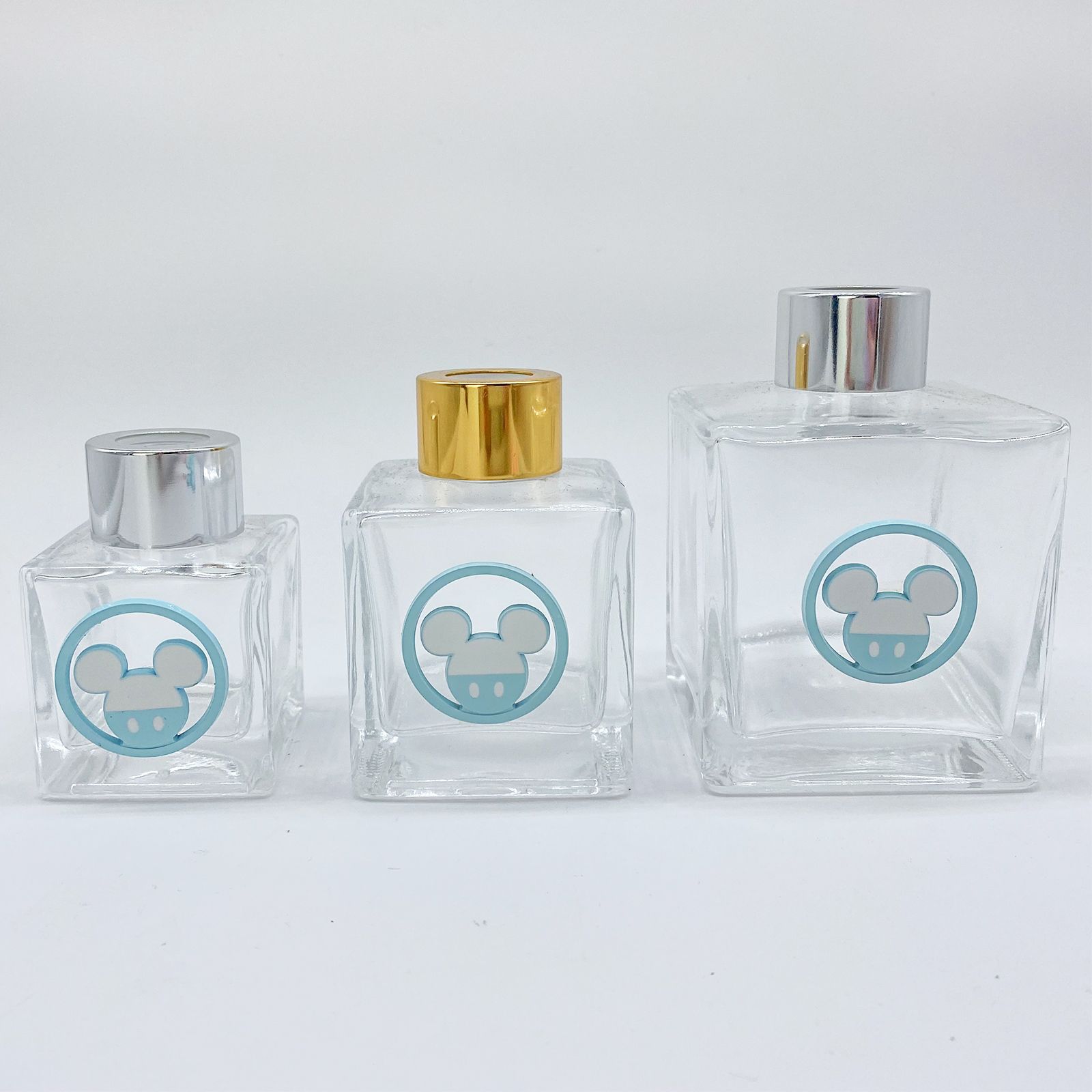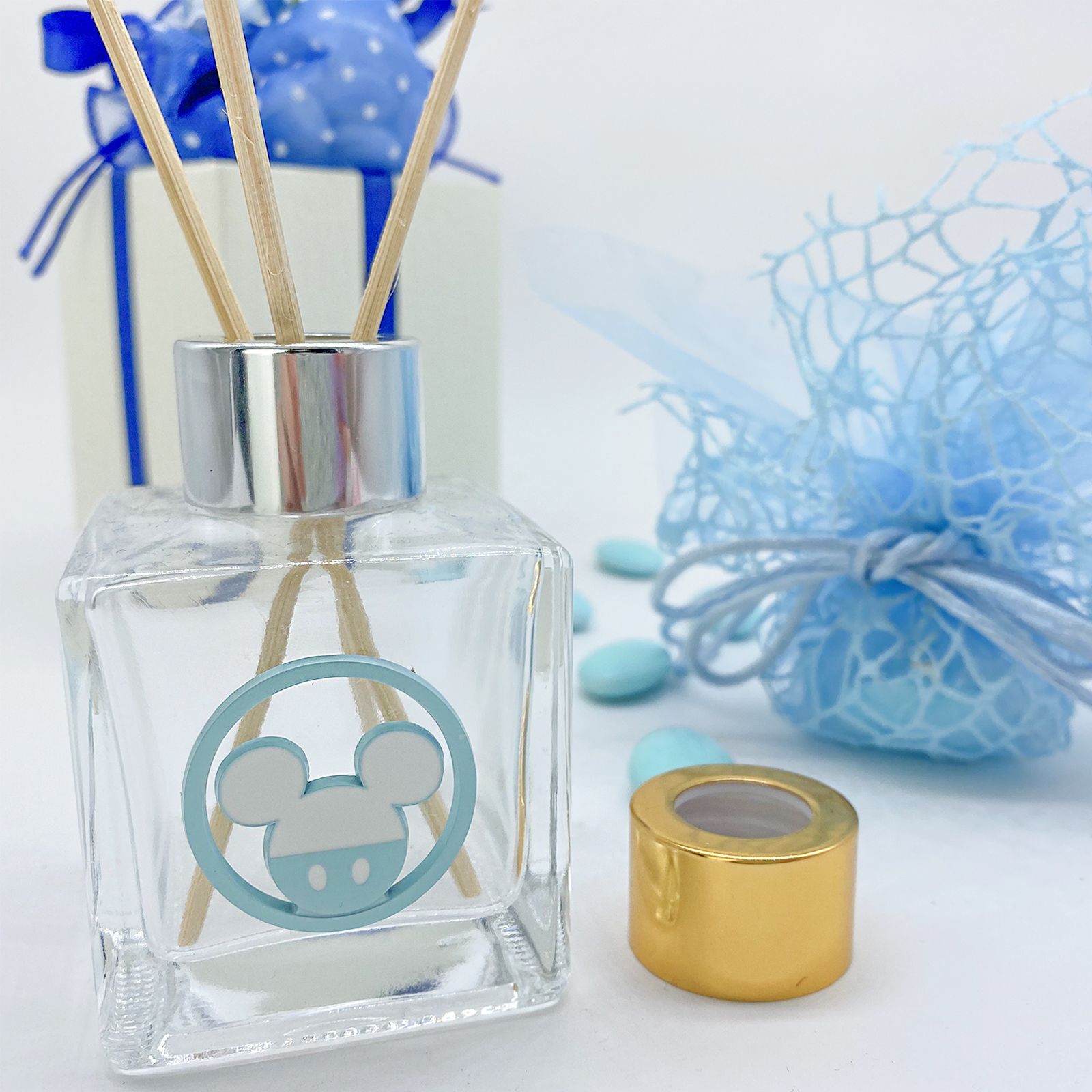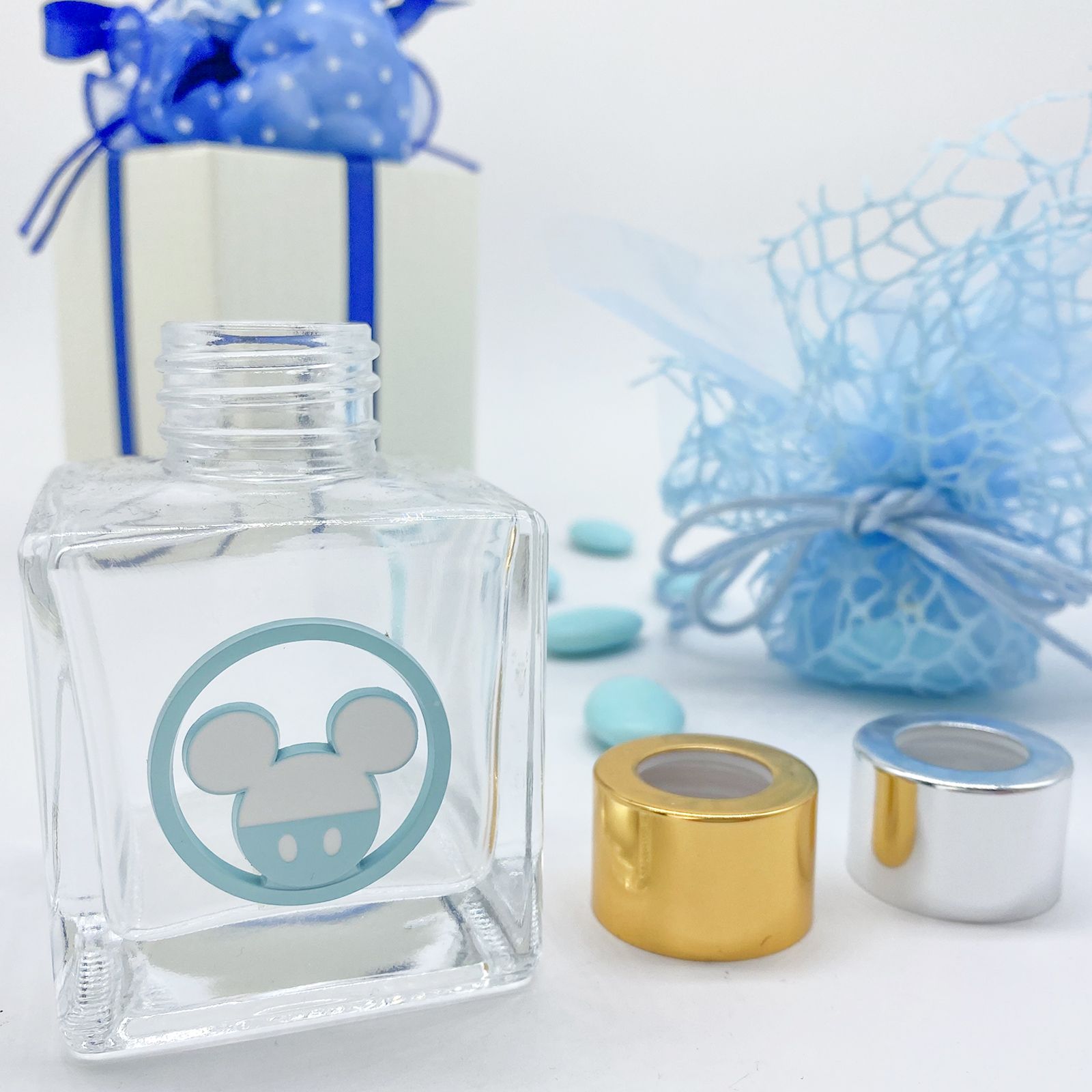 Ecco per te le nostre bottiglie in vetro con decorazione a forma circolare con la sagoma di Topolino in bianco e azzurro, personalizzabili per diffusori di aromi!