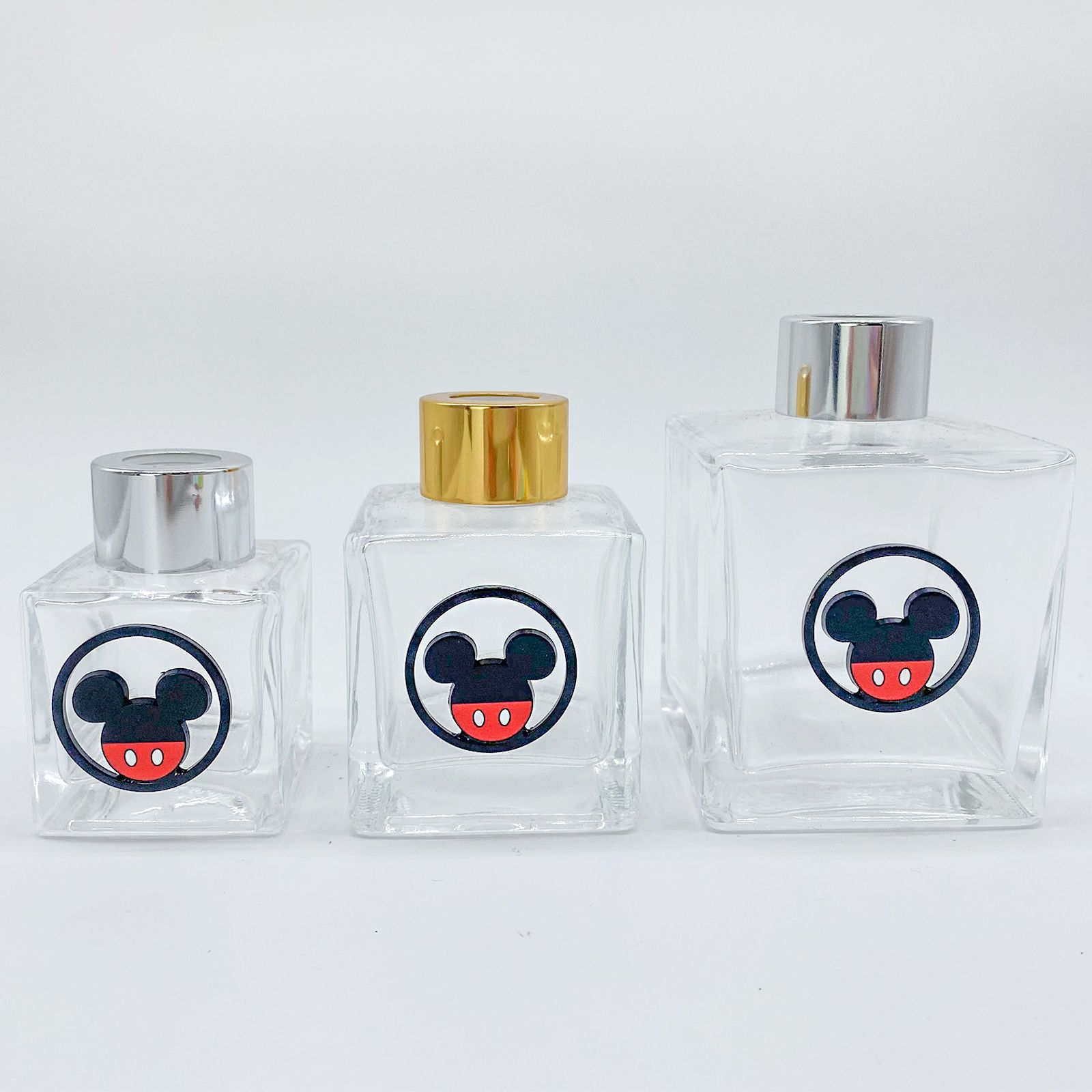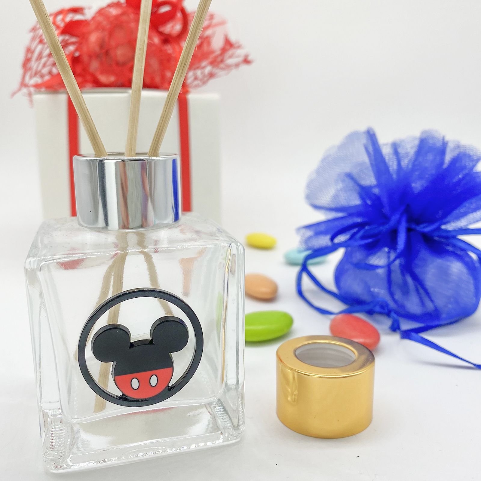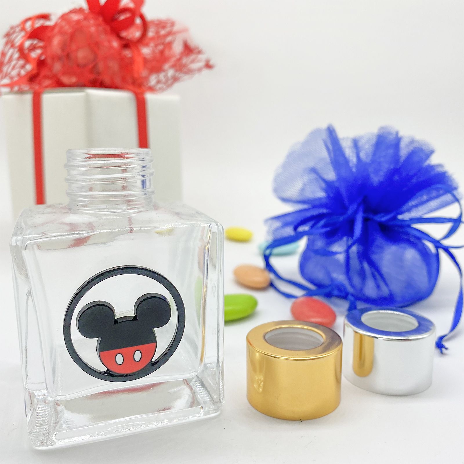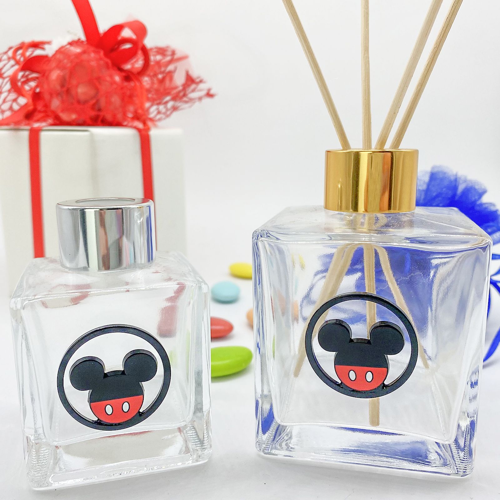 Scegli i nostri flaconi in vetro per profumatori con applicazione in metallo, di forma circolare che rappresenta Mickey Mouse in nero e rosso.