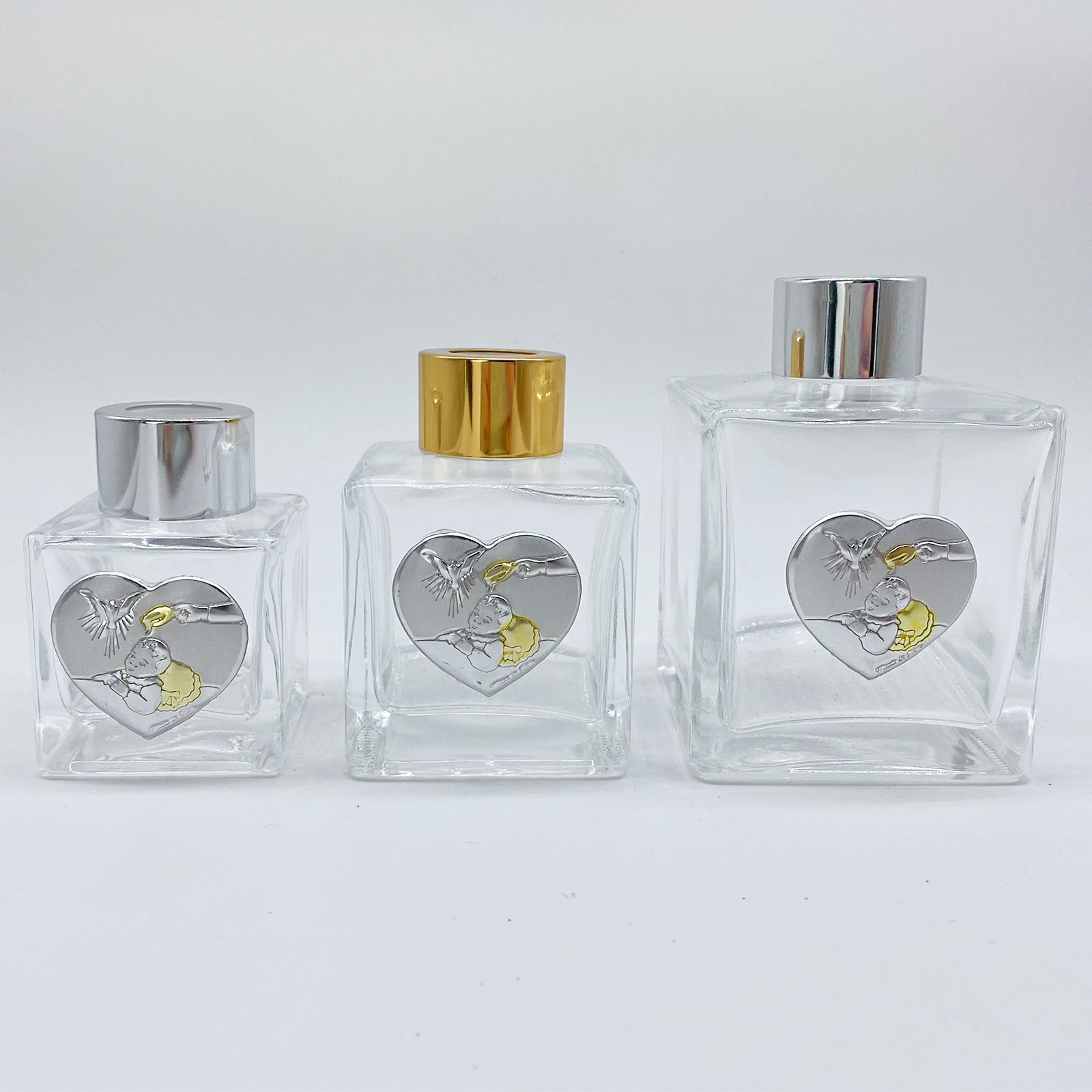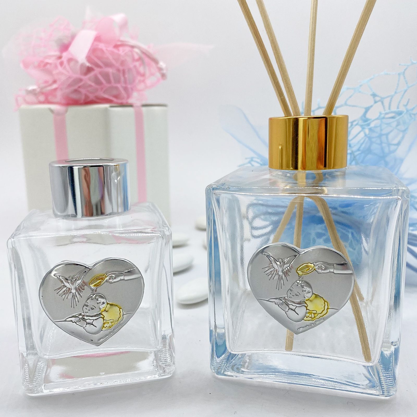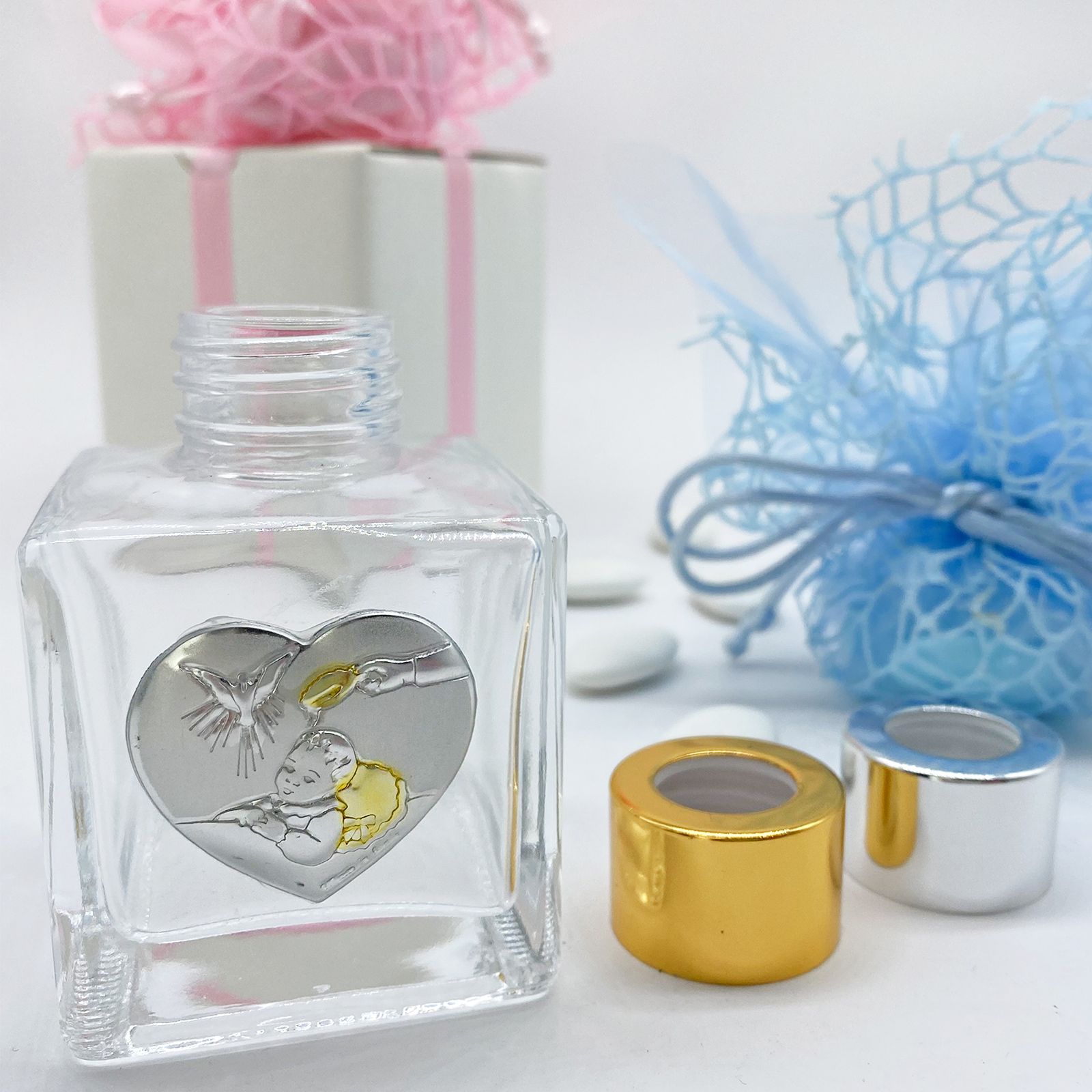 Per te disponibili le nostre bottiglie in vetro per profumatori fai da te a base cubica, con pratico tappo in silicone. Sulla parte frontale della bottiglia è applicata una decorazione in metallo argentata a forma di cuore con rappresentato un/a bambino/a nell'atto di ricevere il battesimo.
