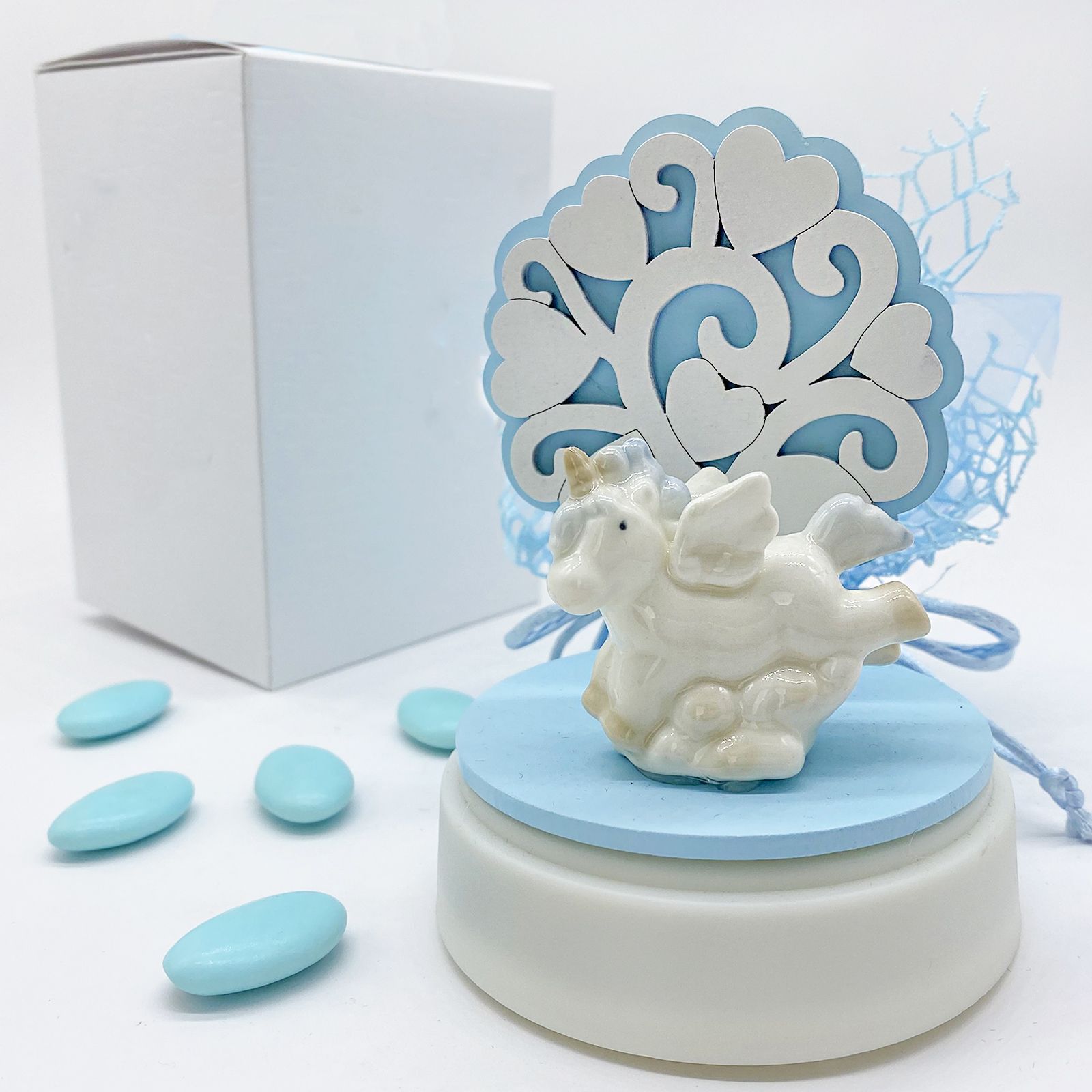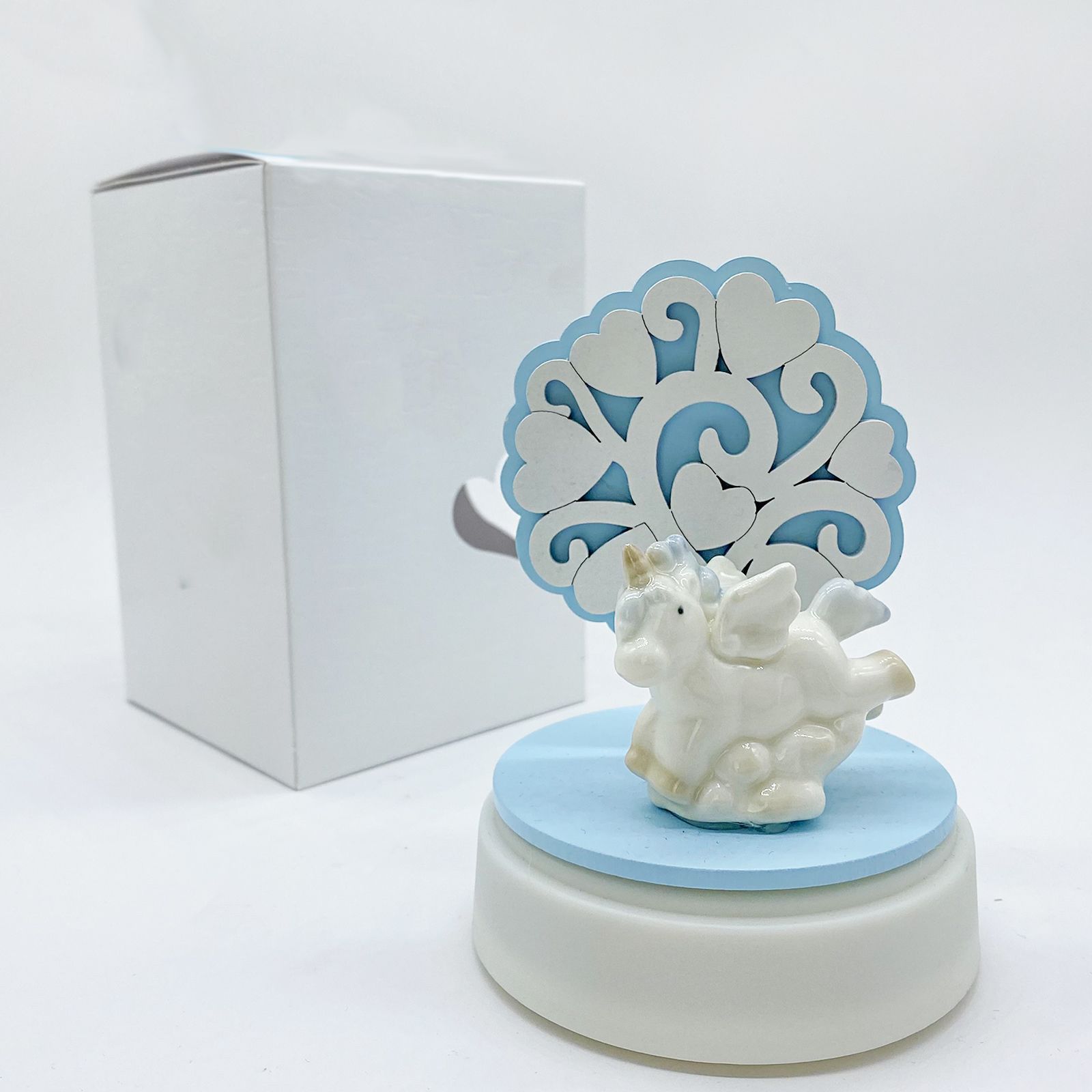 Ti presentiamo i nostri carillon elettronici, realizzati su base circolare con modulo sonoro elettronico (che funziona con 3 pile AAA) che riproduce una ninna nanna melodiosa. Su questa base è montata la sagoma di un albero della vita in legno con sfondo celeste e dettagli bianchi, le cui foglie si trasformano in piccoli cuori. Davanti all'albero è posto un piccolo unicorno in ceramica lucida rappresentato mentre cavalca una piccola nuvola.