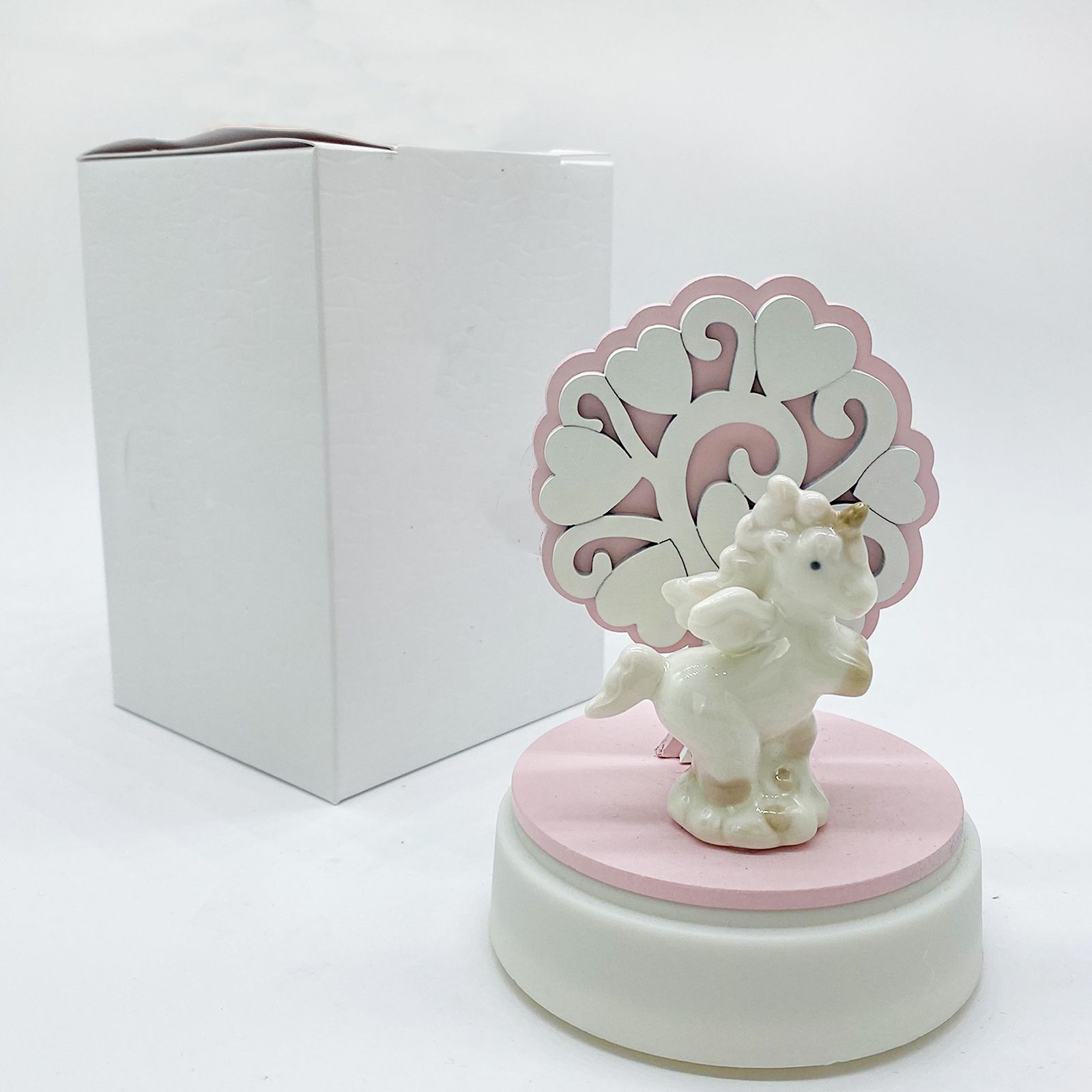 Per te disponibili i nostri carillon elettronici, con albero della vita in legno effetto doppiato bianco e rosa baby e unicorno in ceramica effetto lucido, nelle stesse tonalità. La base del carillon è circolare, con modulo elettronico alimentato da 3 batterie AAA che una volta attivato, riproduce una ninna nanna.