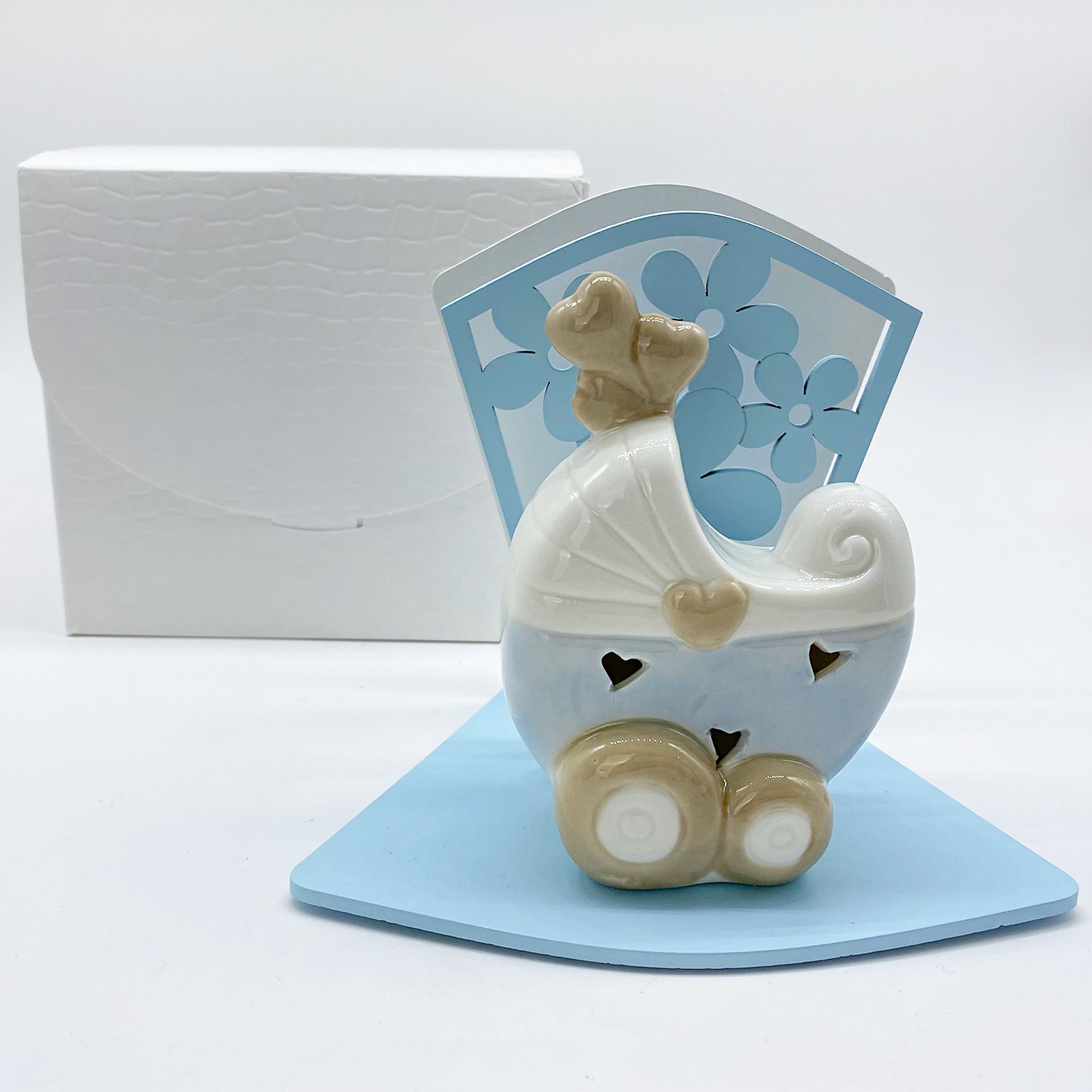 Incantevole lampada a led con struttura in legno a ventaglio celeste a fiori intagliati sulla cui parte frontale è posto un carrozzino in fine porcellana con graziosi cuori traforati in bianco, beige e celeste. Accendendo l'interruttore posto al di sotto della base in legno, il led sprigiona una luce diffusa che rende la lampada notturna bomboniera adatta alla cameretta dei più piccoli.