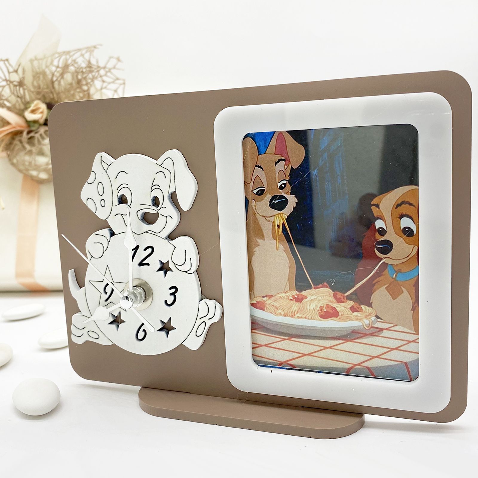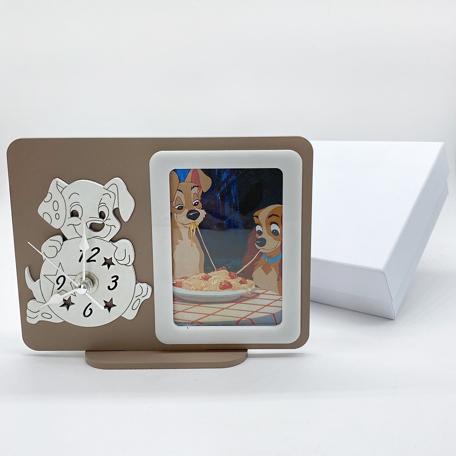 Per te disponibile questo orologio da tavolo in legno con cornice portafoto incorporata raffigurante il cane della Carica dei 101 che tiene tra le zampe il quadrante. Le lancette sono in metallo argentato.