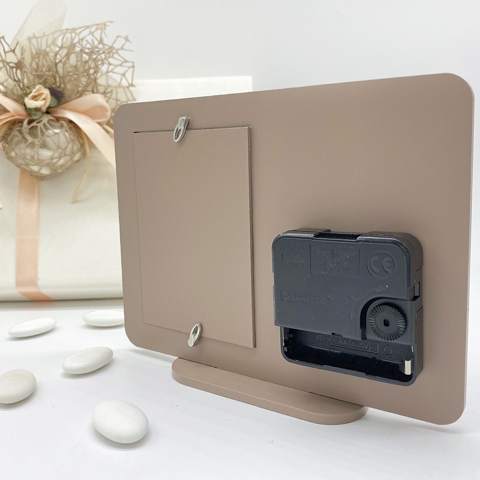 Il meccanismo dell'orologio è montato sul retro e funziona con una normale pila AA (non inclusa).