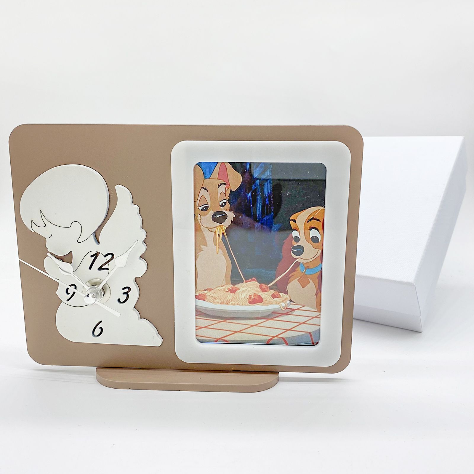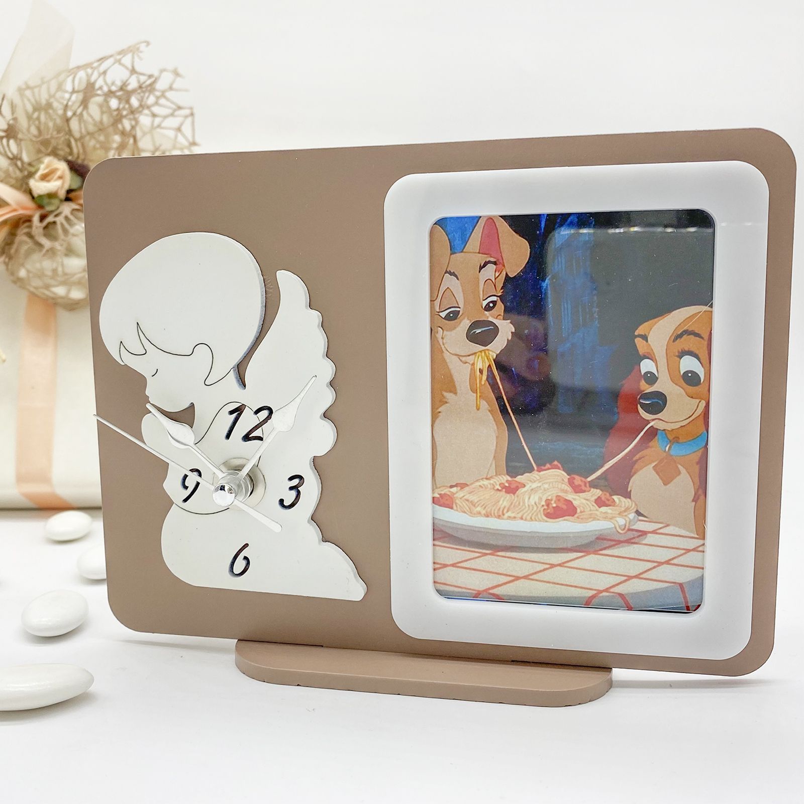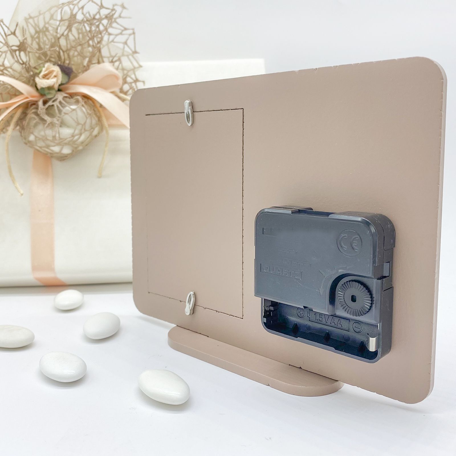 Per te disponibili i nostri orologi da tavolo in legno color tortora, con cornice portafoto integrata. La particolarità di questi orologi bomboniere sta nel fatto che al posto del quadrante, è collocato un angioletto in legno bianco, ritratto di profilo con le mani giunte in preghiera. Le lancette dell'orologio sono in metallo e il meccanismo è posto sul retro, dove è possibile collocare la batteria AA prevista per il funzionamento (non inclusa).