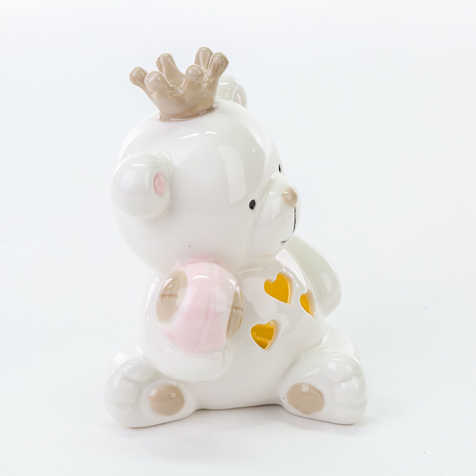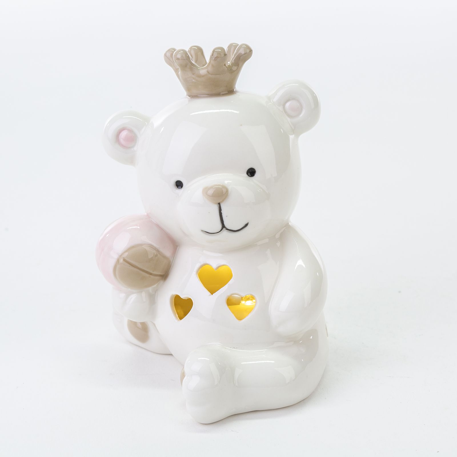 Per te sul nostro store, questi dolcissimi orsetti in porcellana bianca con dettagli tortora e rosa baby, con sulla pancia dei cuoricini cavi da cui filtra la luce del dispositivo led il cui interruttore è posto sotto la base dell'orsetto.