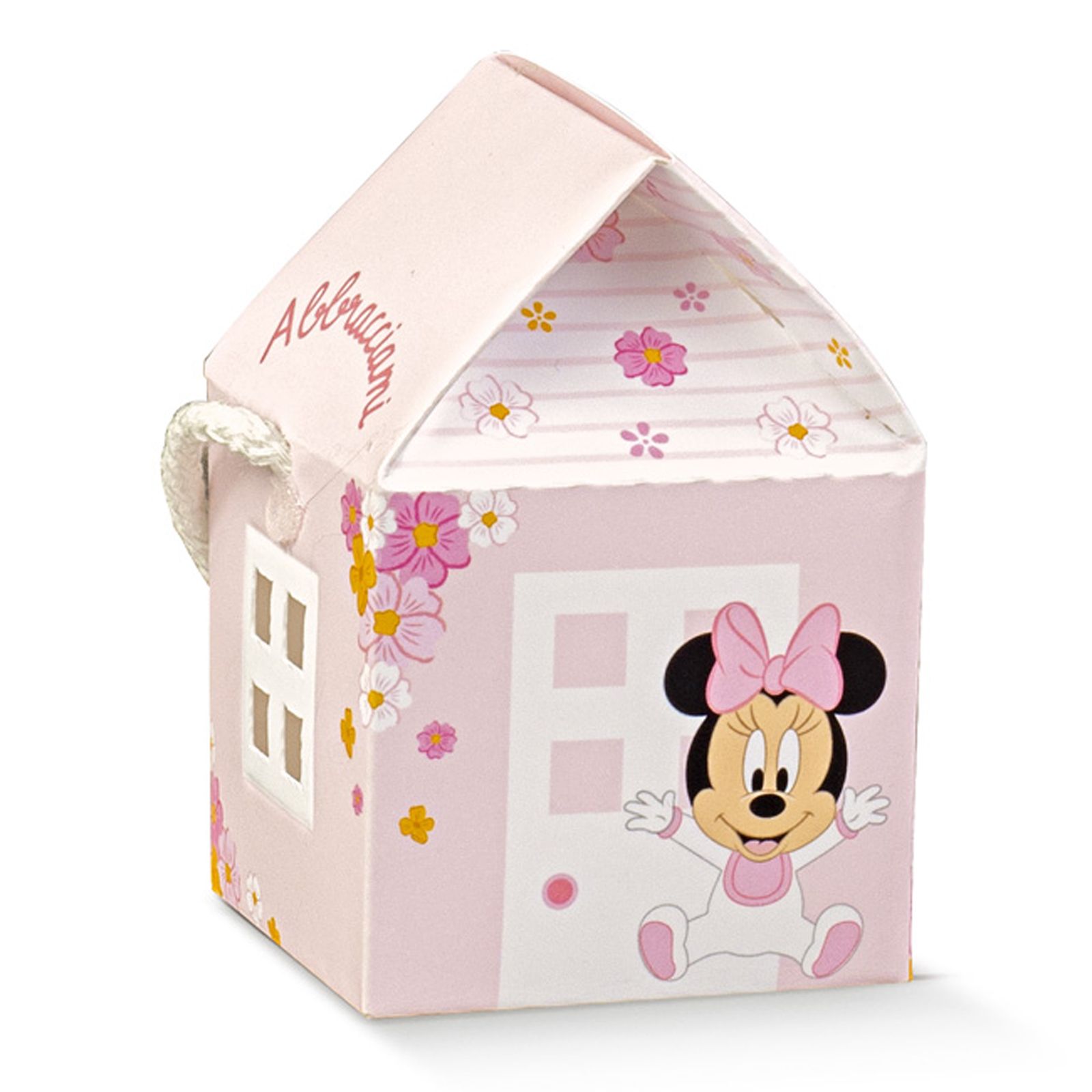 Con le nostre scatoline per confetti in cartoncino a forma di casetta, realizzare le tue confettate economiche tema Disney sarà divertente! Le scatoline sono di colore rosa con su tre lati delle finestrelle intagliate che permettono di vedere l'interno e sul lato frontale una piccola Baby Minnie raffigurata seduta a braccia aperte. Sul tetto della casetta ai due lati è riportato il testo "Abbracciami" e alla casetta è applicato un cordoncino bianco che permette di trasportarla e appenderla.