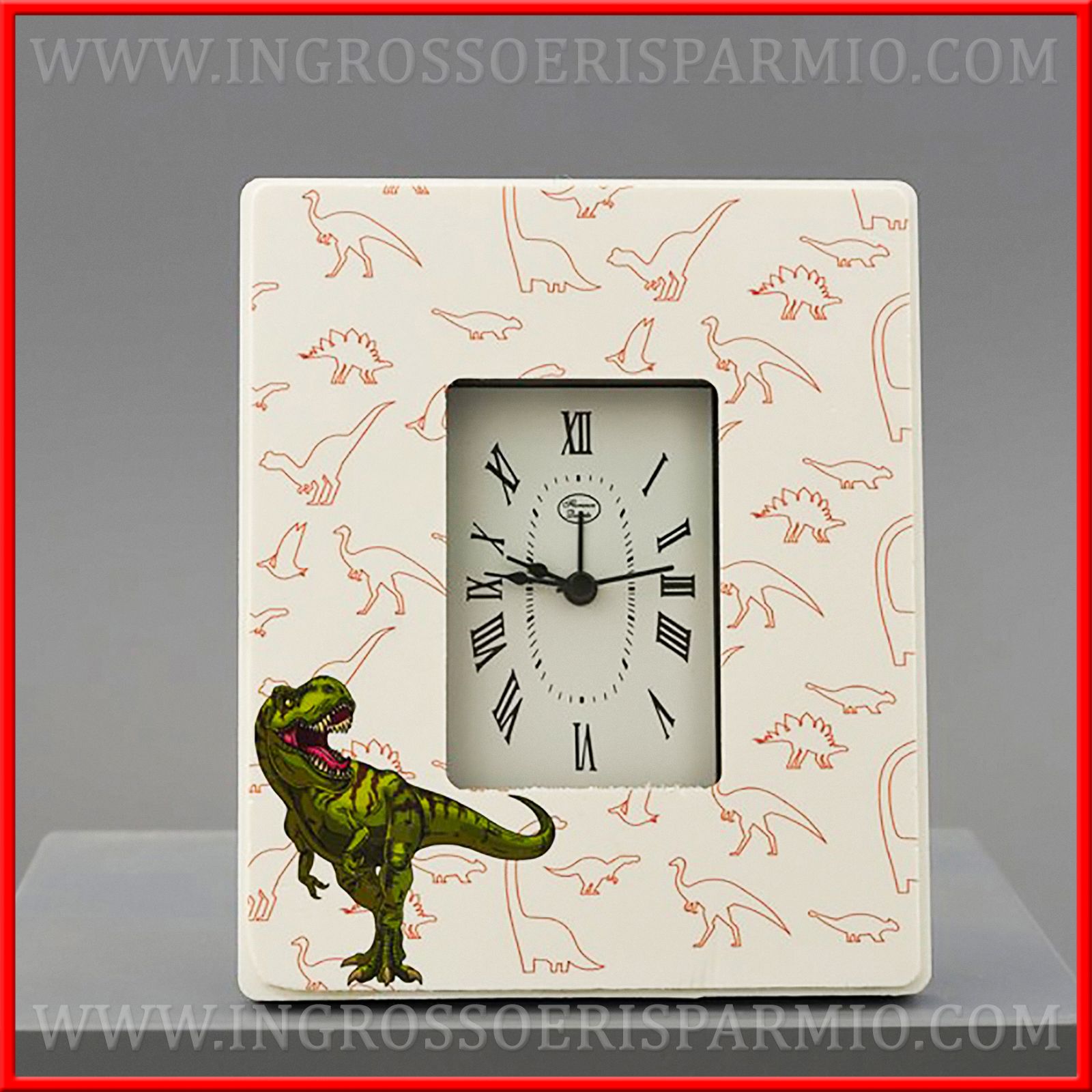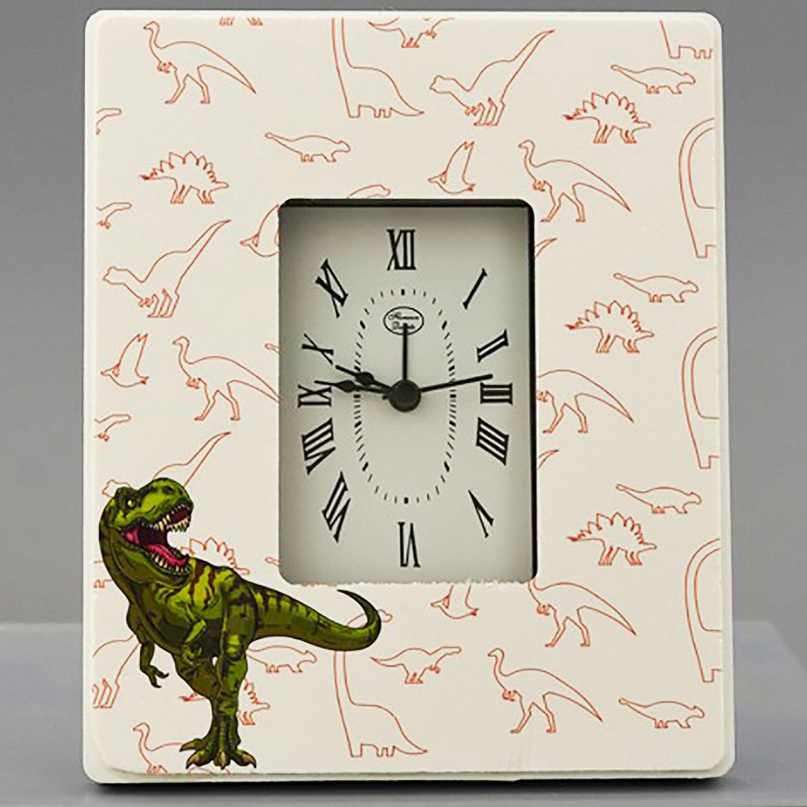 Come questi orologi al quarzo da tavolo con fantasia di dinosauri arancioni e t-Rex verde in primo piano in basso a destra.