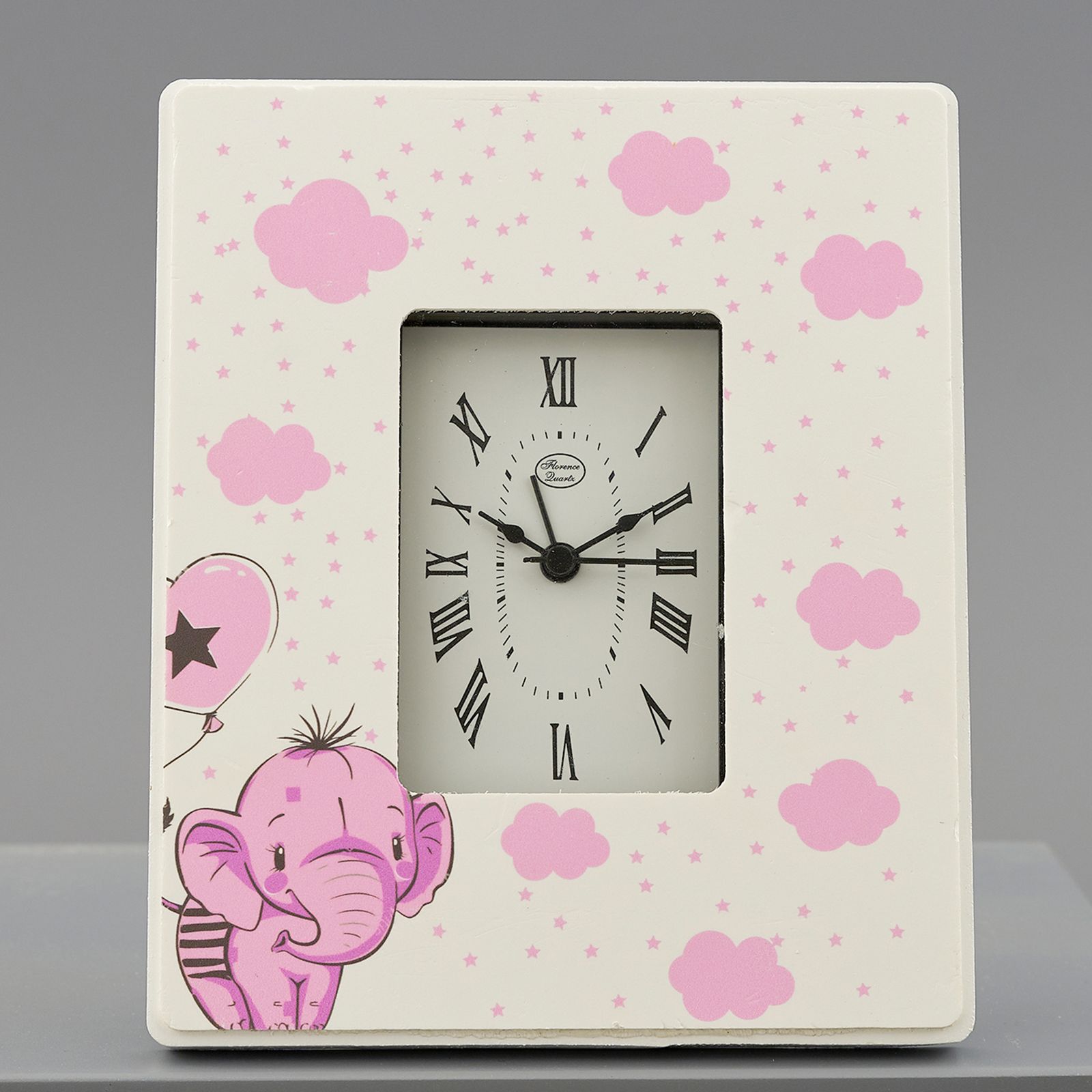 Per te disponibili sul nostro store questi bellissimi orologi da tavolo con cornice esterna in legno e meccanismo funzionante con pila AA. Ogni orologio ha una fantasia con nuvolette ed elefantino rosa con un palloncino a forma di cuore della stessa tonalità. Nella parte posteriore è presente un supporto in legno che permette all'orologio di rimanere fermo.