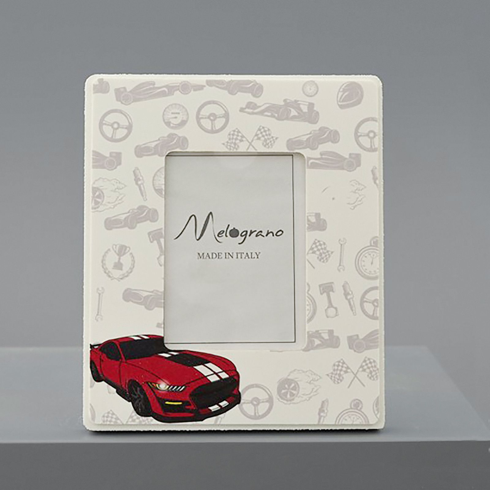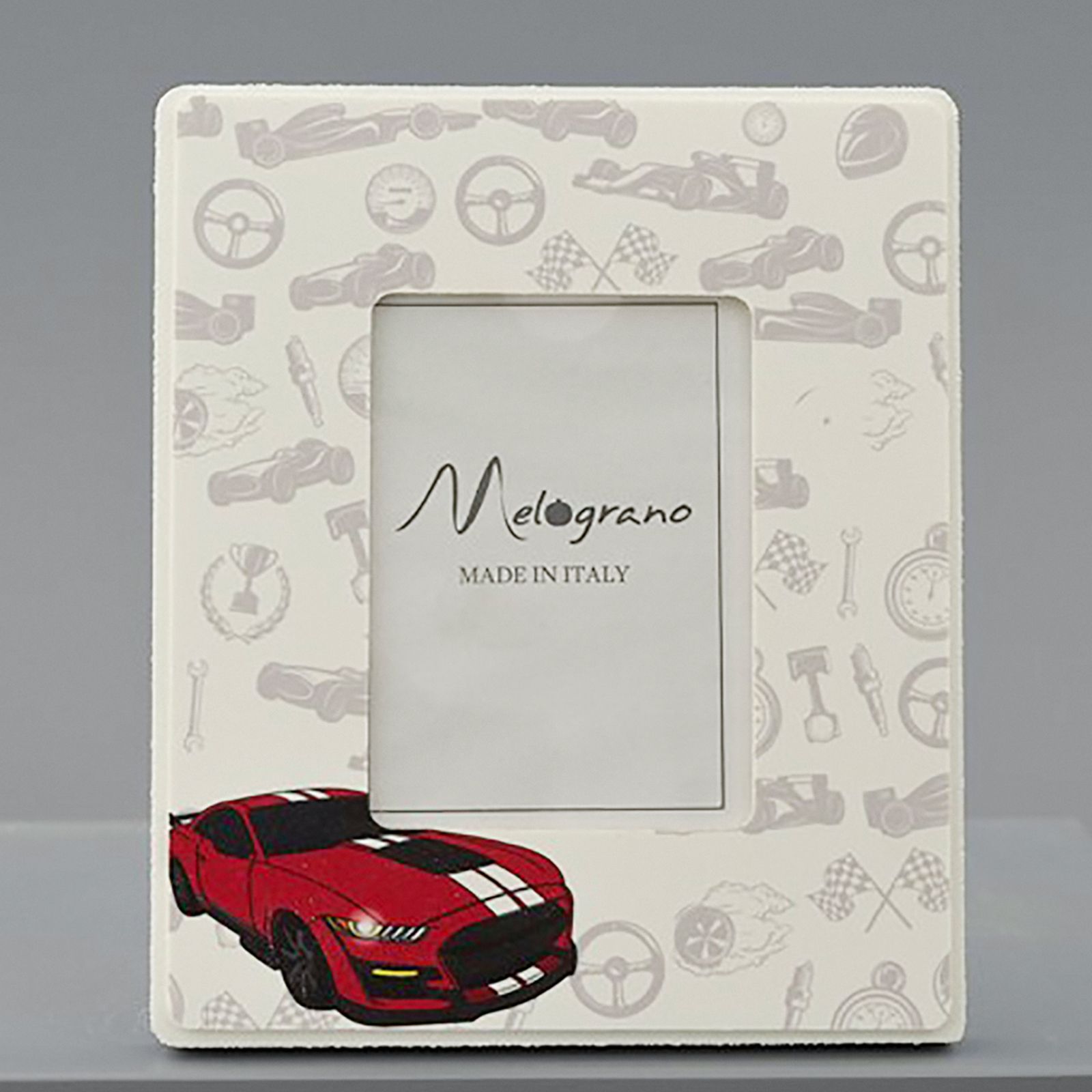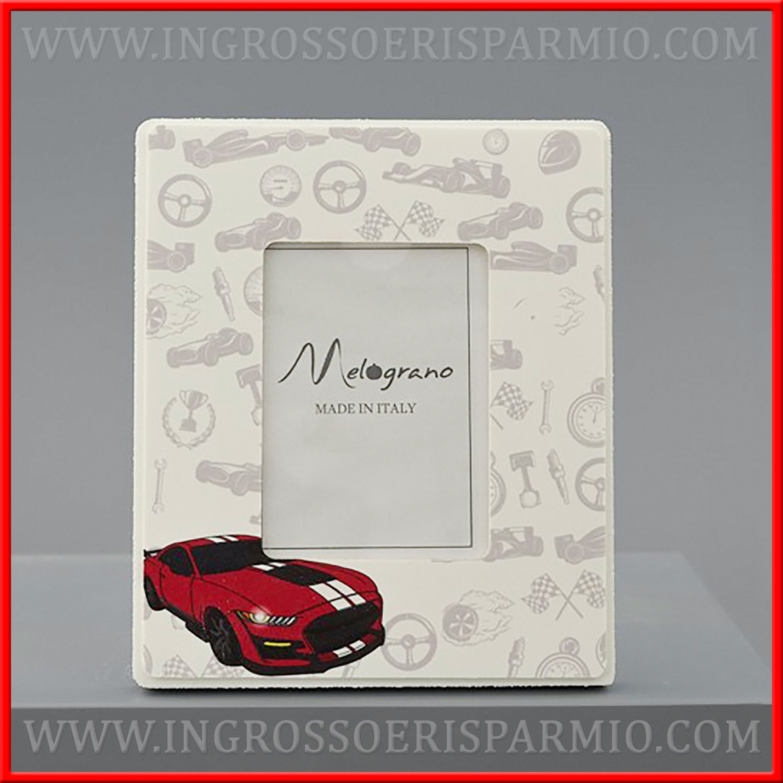Come queste graziose cornici portafoto da tavolo in legno con un pattern grigio raffigurante auto da corsa e componenti automobilistici con in primo piano, in basso a sinistra una splendida auto da corsa rosso fiammeggiante.