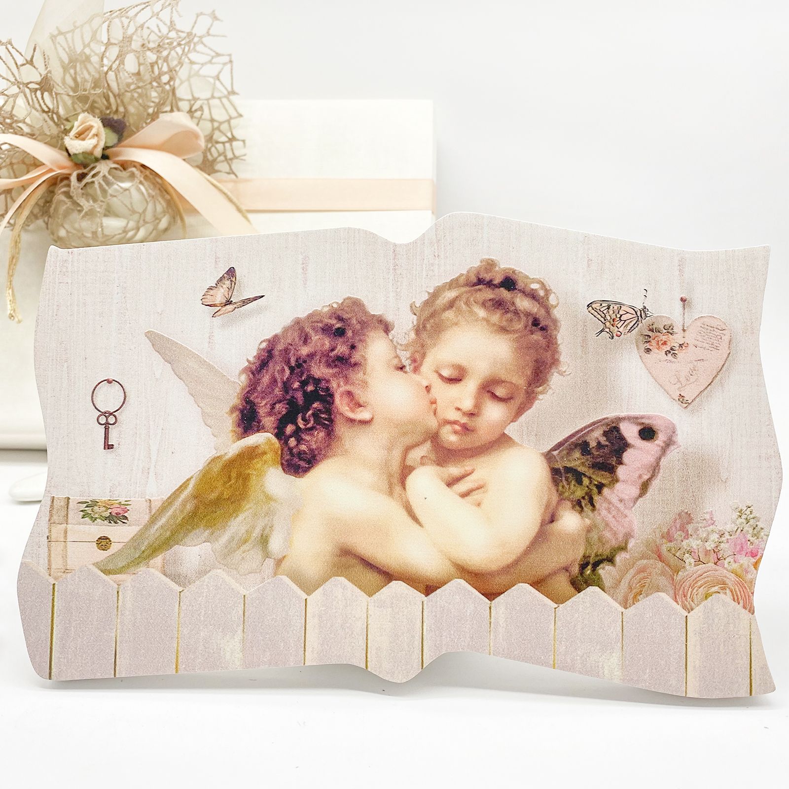 Acquista sul nostro store la qualità italiana di questi quadretti da appoggio in legno naturale a base bianca con riproduzione del famoso dipinto di Bouguereau "Amore e Psiche" conosciuto anche come "Il primo bacio" e piccole decorazioni con cuori, fiori e chiavi che rendono i quadretti dei perfetti complementi d'arredo shabby chic!