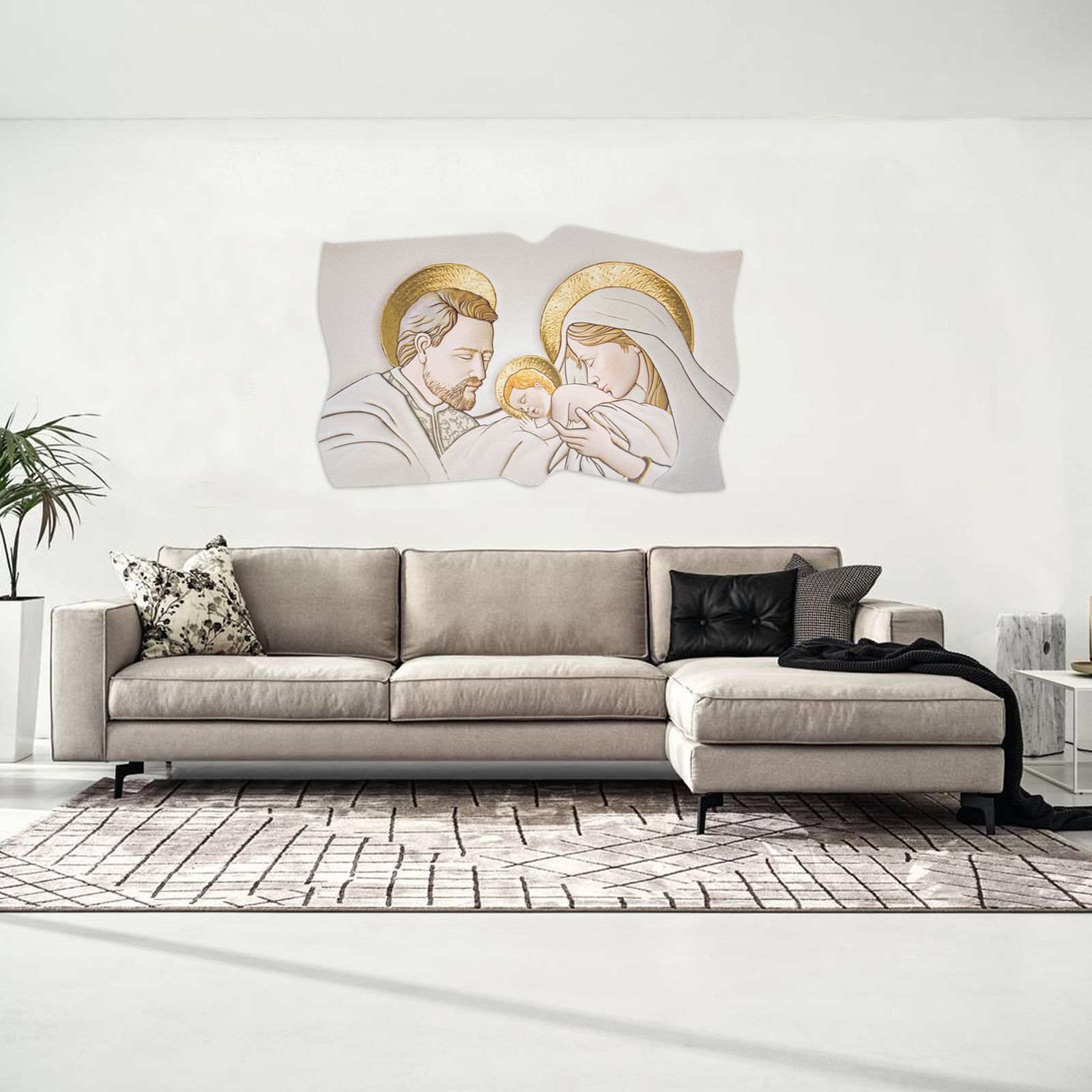 Quadri sacri, disponibili da appoggio e da parete, realizzati in legno su base bianca, raffiguranti la Sacra Famiglia nelle tonalità dell'oro, ritratta con la Madonna che bacia dolcemente Gesù Bambino rappresentata accanto a San Giuseppe.