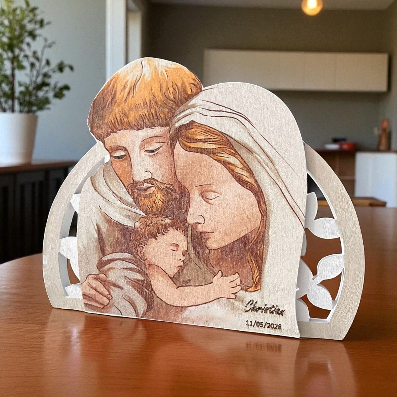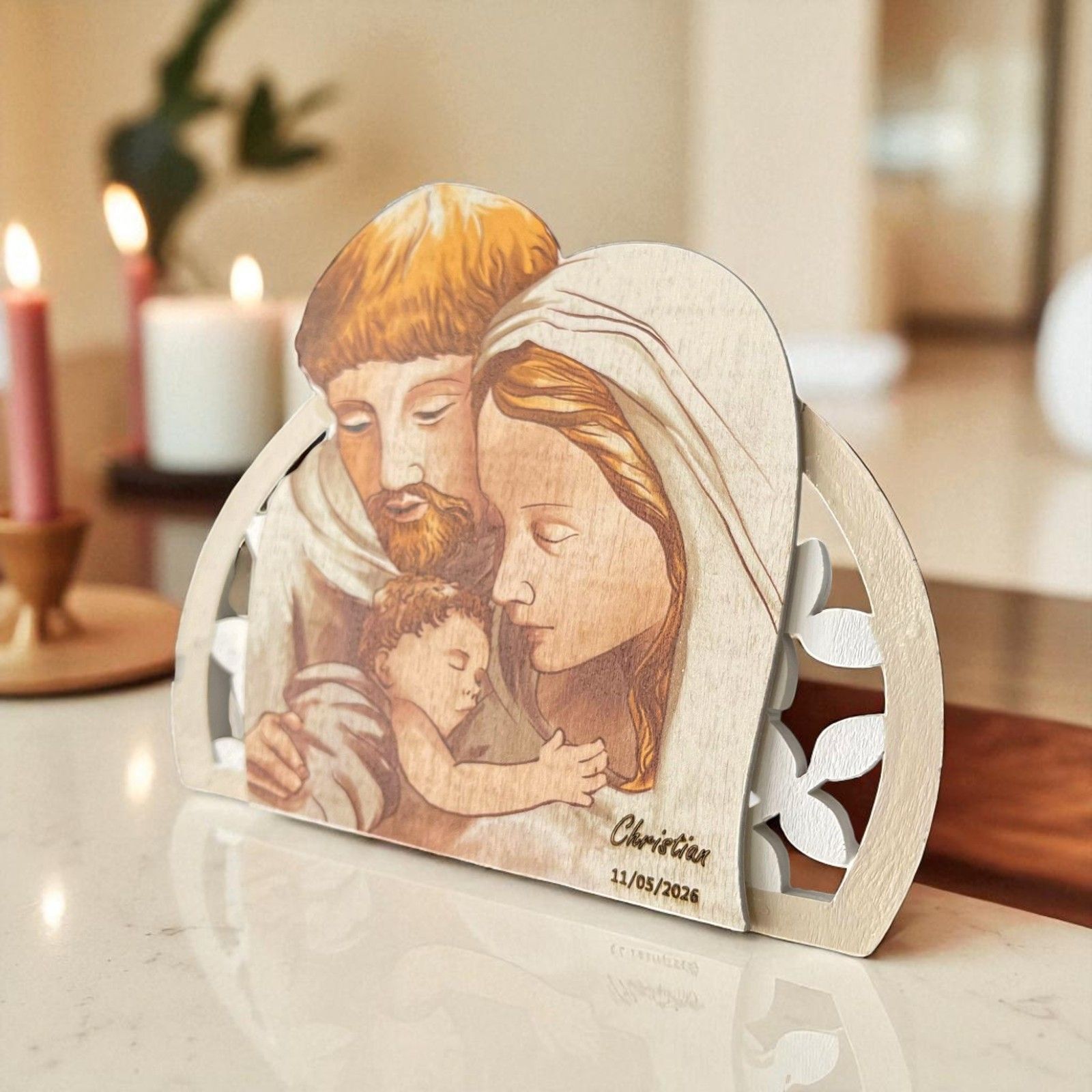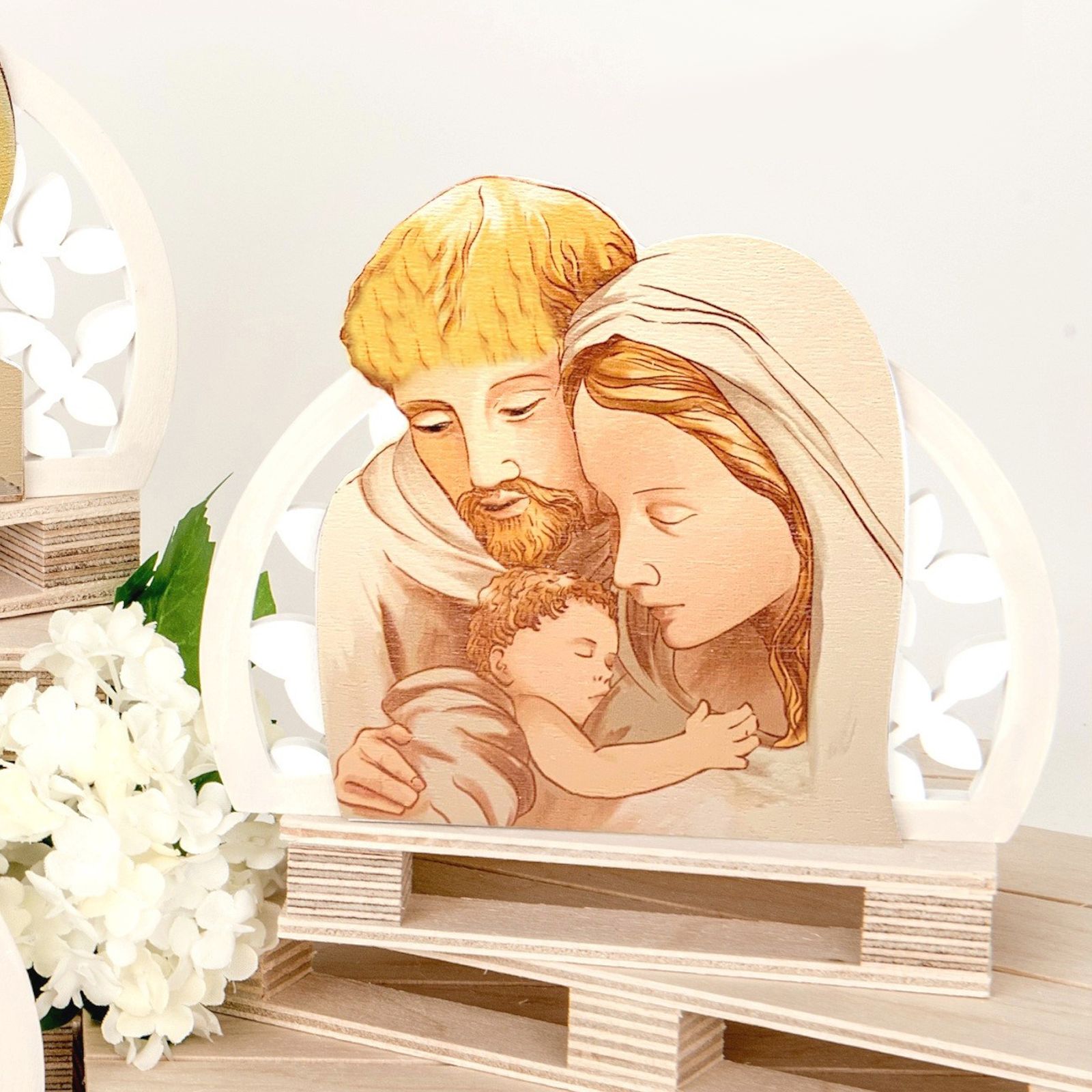 Icone finemente lavorate che raffigurano la Sacra Famiglia, realizzate in legno dipinto e resina, dai colori tenui e delicati. La struttura è dotata di un piccolo piedino d’appoggio incluso, che consente all’icona di rimanere in piedi autonomamente.