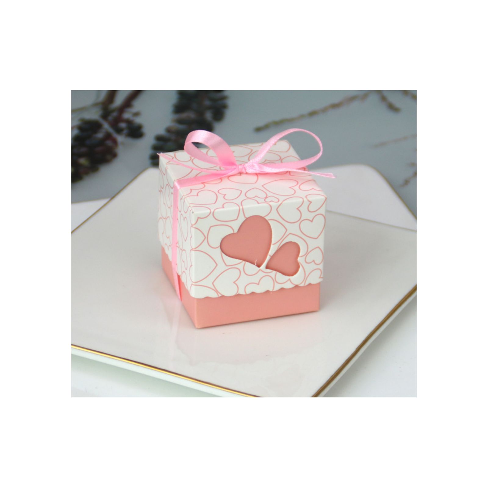 Scatolette portaconfetti in cartoncino, di forma cubica, ad incastro, in doppio colore, rosa e bianco, con decoro a cuoricini sulla parte superiore.