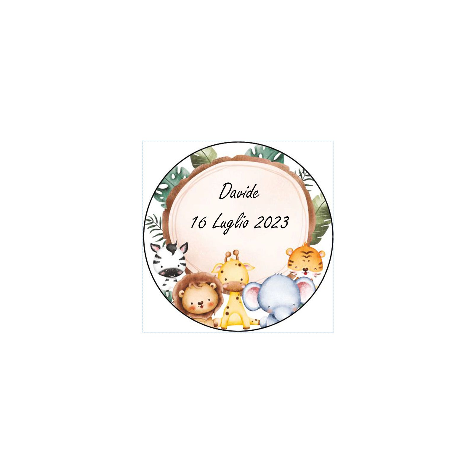 Disponibili per te sul nostro store questi graziosissimi portaconfetti tag circolari tema giungla con animaletti e un decoro di foglie tropicali. Al centro invece è disponibile uno spazio libero per la stampa personalizzata, che potrai decidere di aggiungere o meno.